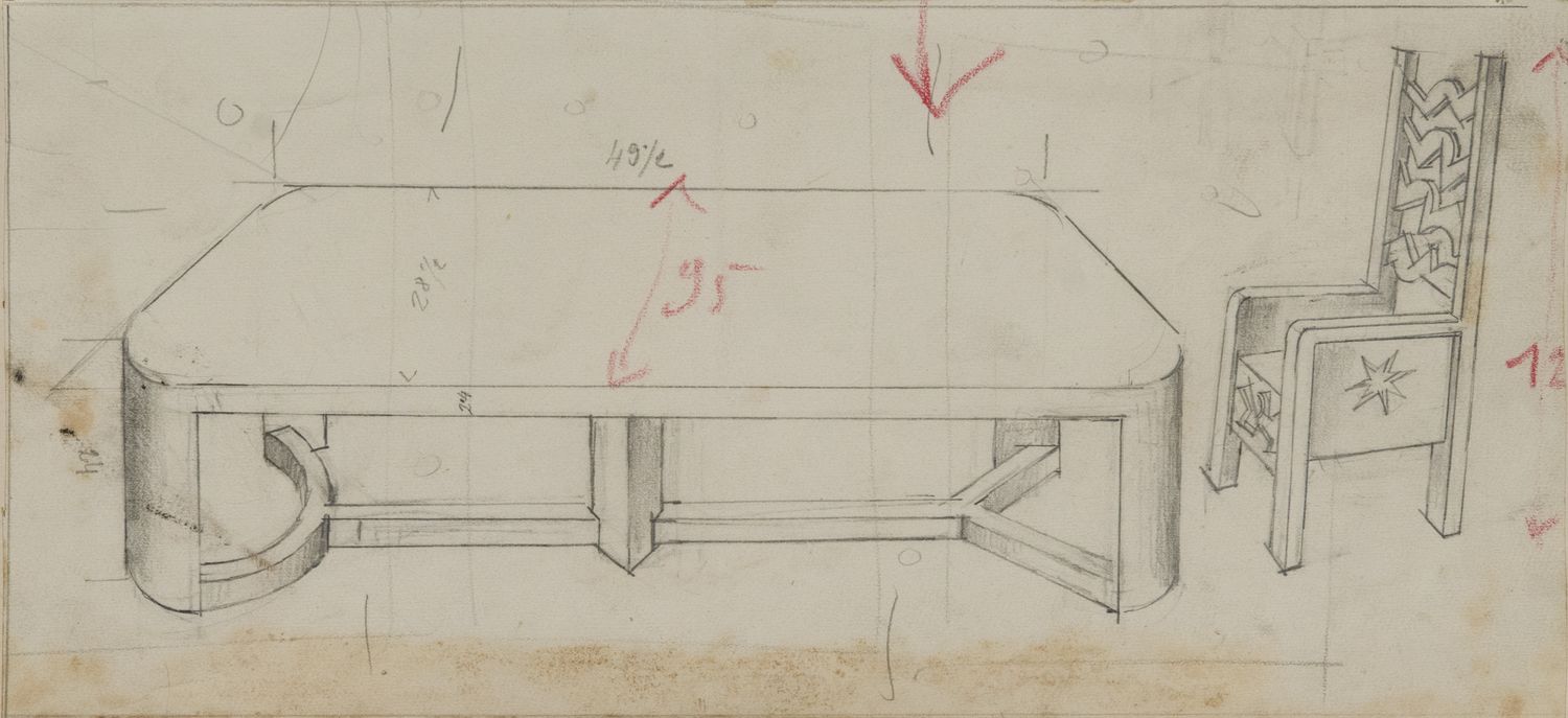 Fortunato Depero (1892-1960) Tavolo e sedia matita su carta cm 18,8x38,7 eseguito nel 1925-1926 Opera registrata nel Catalogo Generale Ragionato delle Opere dell’Artista con n. FD-4091-DIS Per una bibliografia di riferimento dei mobili eseguiti cfr. Belli, G. (a cura di), La Casa del Mago, catalogo mostra Mart, Rovereto 1992, pp. 374-375. Si tratta di un uno disegno molto importante perché ci informa sulla primissima idea del grande tavolo e delle particolari sedie dallo schienale elaborato che Depero poi realizzò (con un’ulteriore elaborazione, specie alle sedie) per casa sua e che ora sono esposte al Museo Depero.