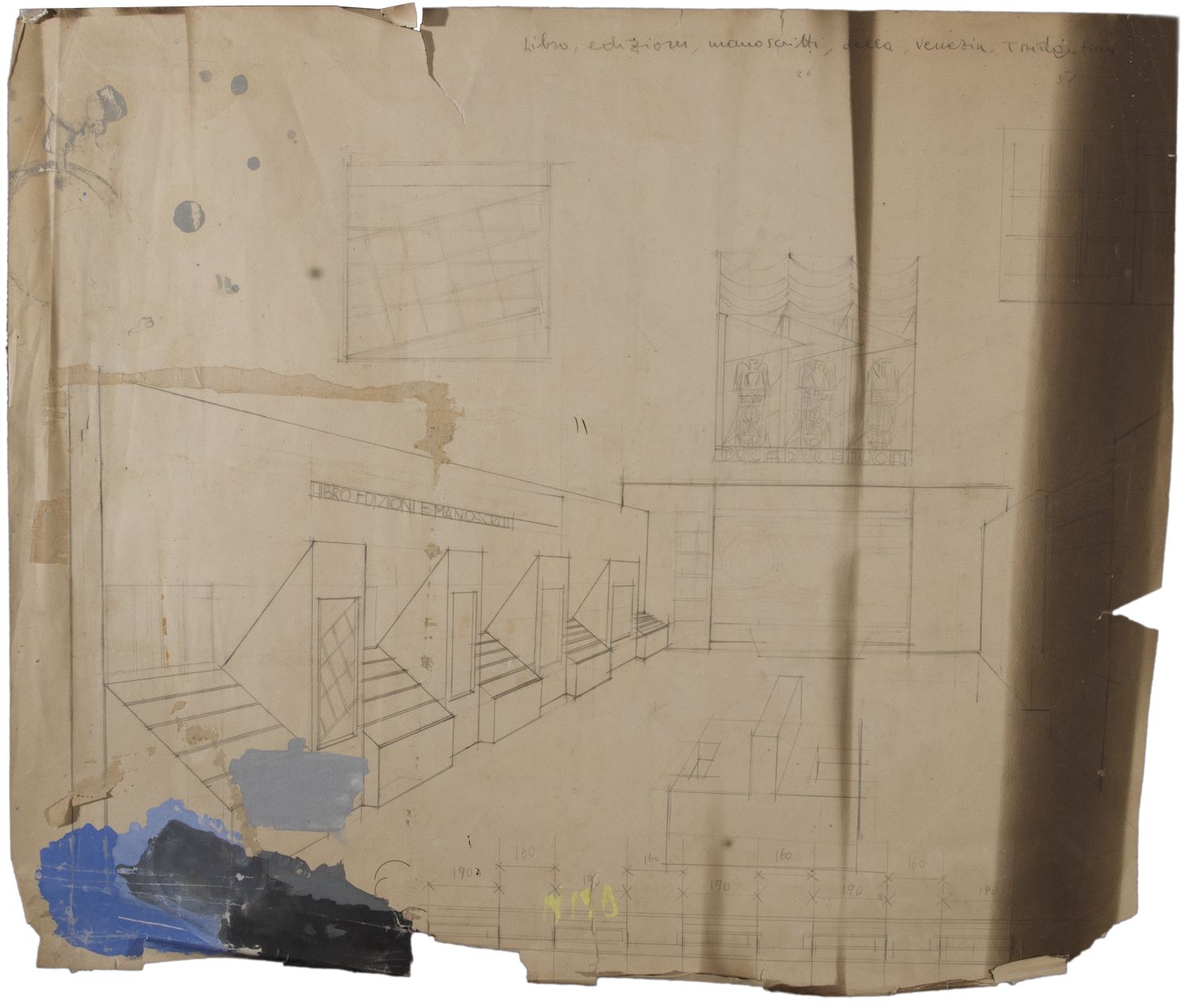 Fortunato Depero (1892-1960) Libro, Edizioni, Manoscritti della Venezia Tridentina titolo in alto a destra matita su carta cm 49,5x59,2 eseguito nel 1937 ca Opera registrata nel Catalogo Generale Ragionato delle Opere dell’Artista con n. FD-4084-DIS Si tratta dello studio di allestimento della “Sala della stampa” nell’ambito della “VI Sindacale d’Arte” tenuta alle Scuole Sanzio di Trento nel 1937.