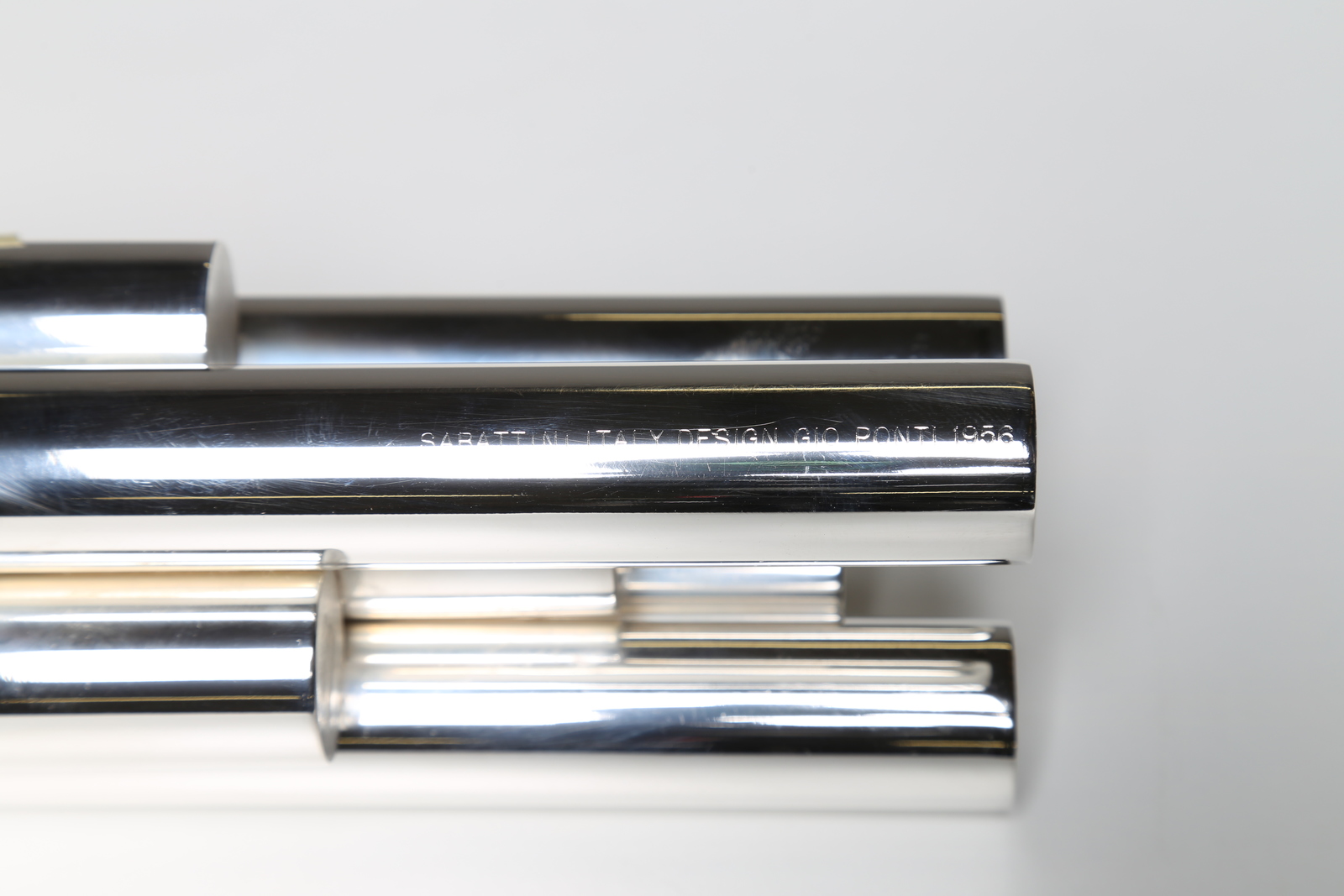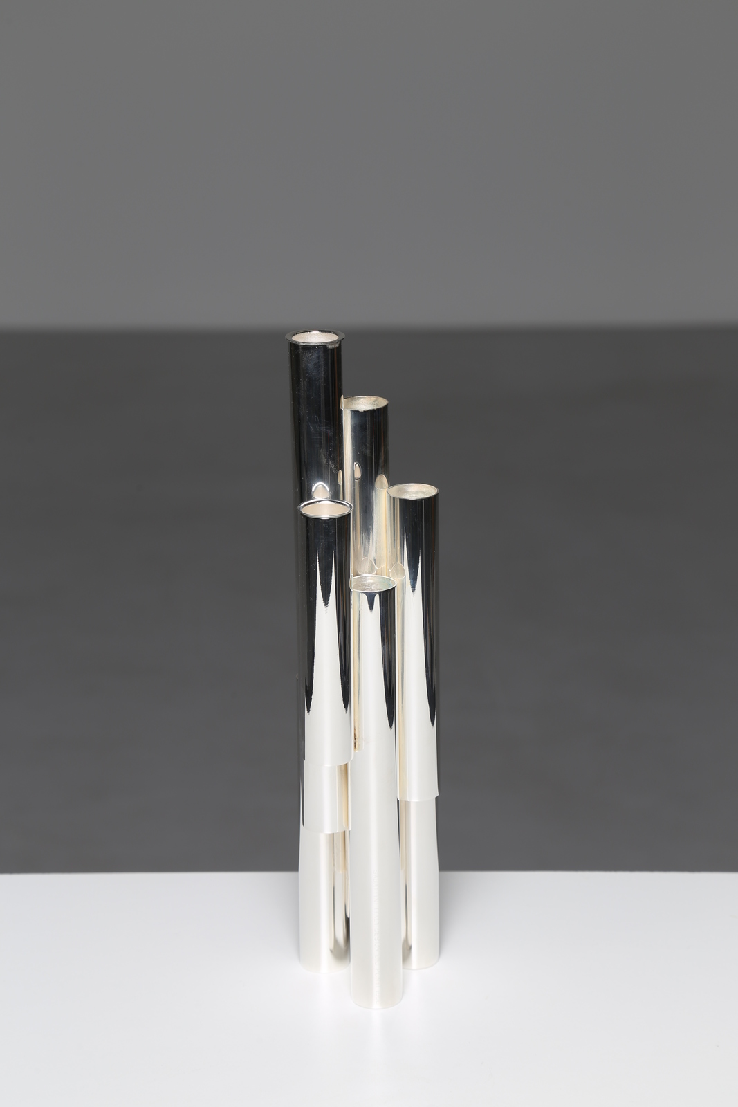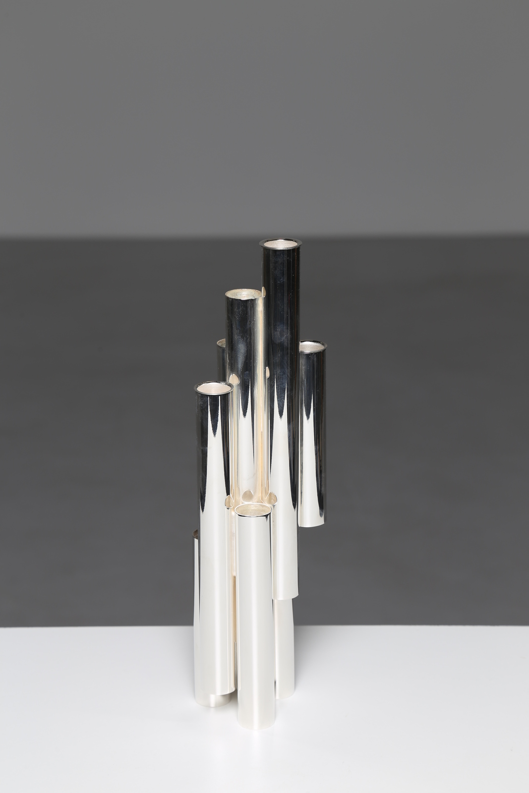 PONTI GIO' (1891 - 1979) Candeliere-fioriera costituito da otto cilindri in metallo argentato accorpati e saldati. Per Sabattini, 1956. . Ottone argentato. Cm 9,00 x 33,00 x 7,00. anni 50