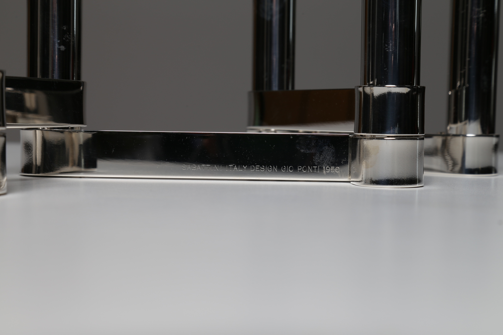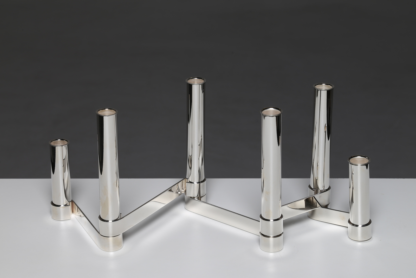 PONTI GIO' (1891 - 1979) Centro tavola portafiori o candeliere snodabile in metallo argentato, produzione Sabattini 1956 . Ottone argentato. Cm 47,00 x 18,00 x 20,00.