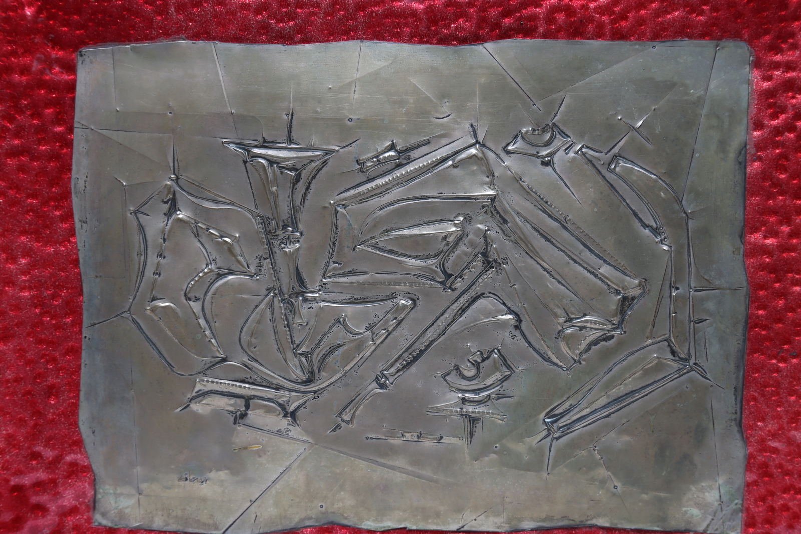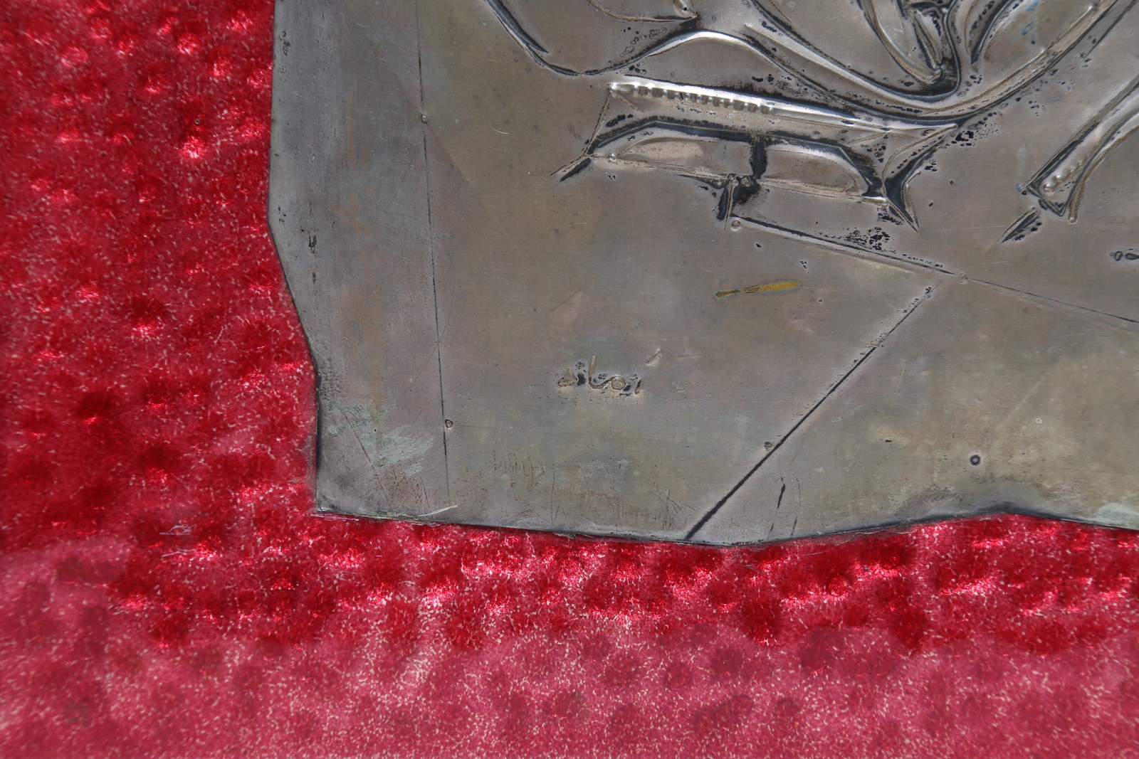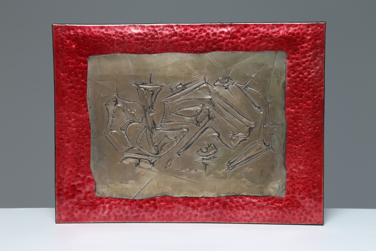 ALOI ROBERTO Una lamina di argento sbalzato e rame sbalzato smaltato, 1964. Argento e rame. Cm 39,00 x 29,50 x 1,00. anni 60