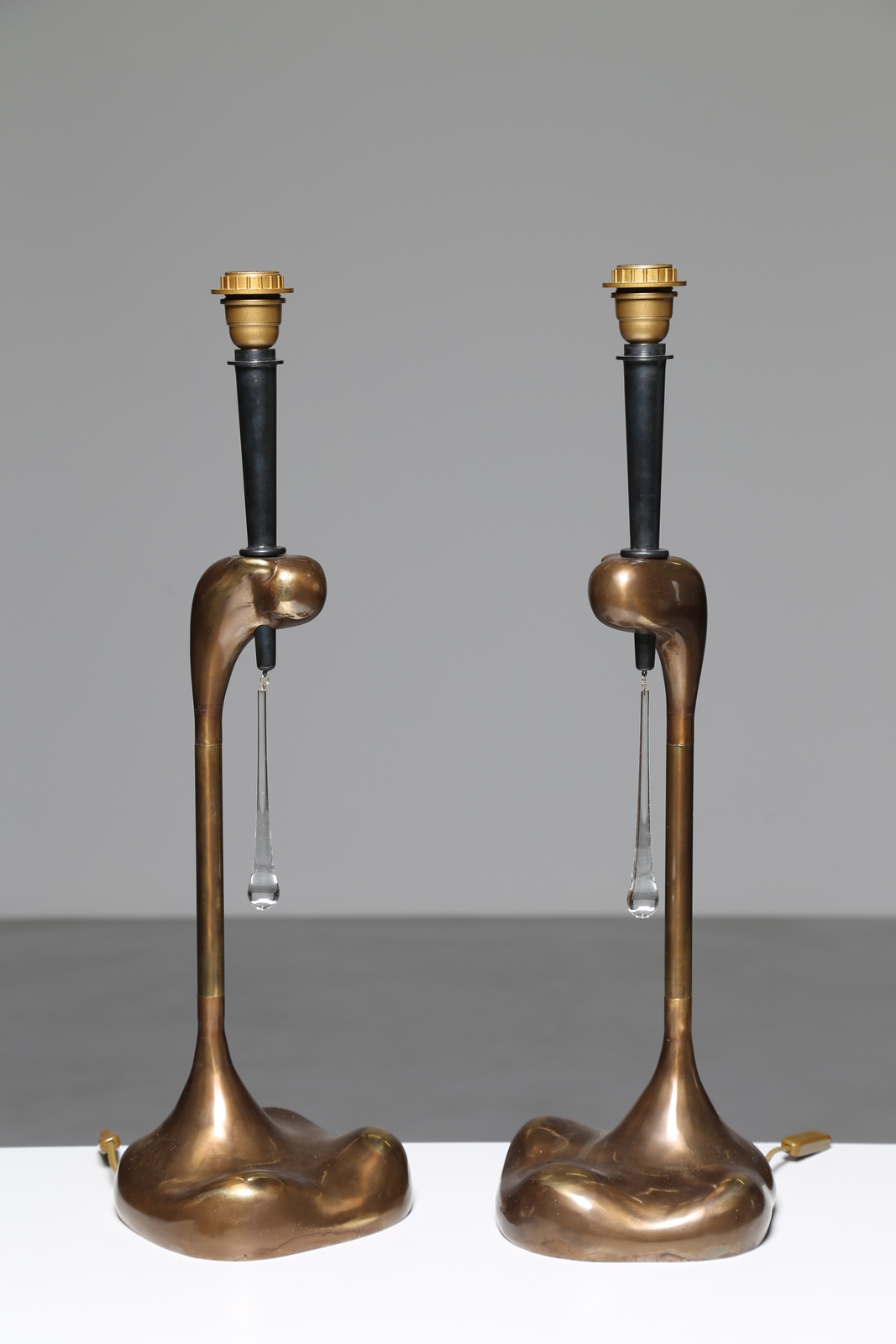 BANCI ALESSANDRO Coppia lampade da tavolo in metallo, vetro e fusione in ottone, Firenze 1970 . Metallo, vetro e ottone. Cm 22,50 x 69,00 x 21,00.
