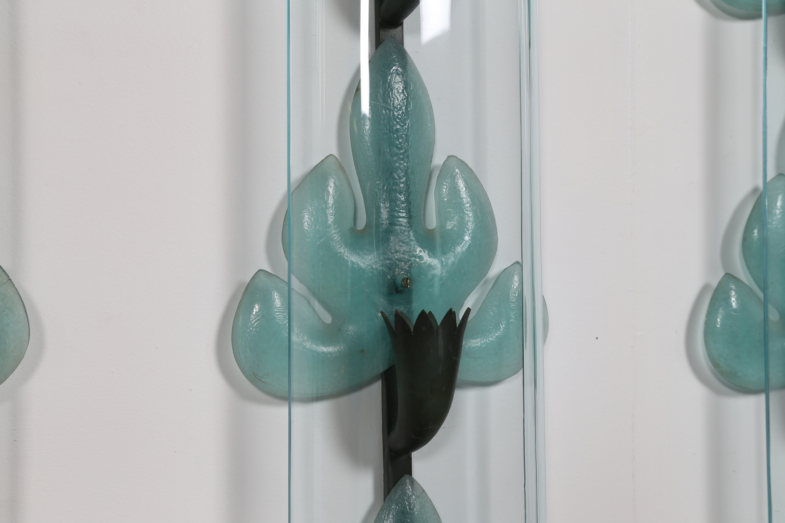 POLI FLAVIO (1900 - 1984) Tre appliques in vetro di murano acidato, cristallo, e metallo ossidato, realizzate da Seguso vetri d'arte, provenienti dall'Hotel Bristol di Merano, 1947. Vetro di murano acidato, cristallo e metallo ossidato. Cm 14,50 x 80,50 x 8,00. anni 40