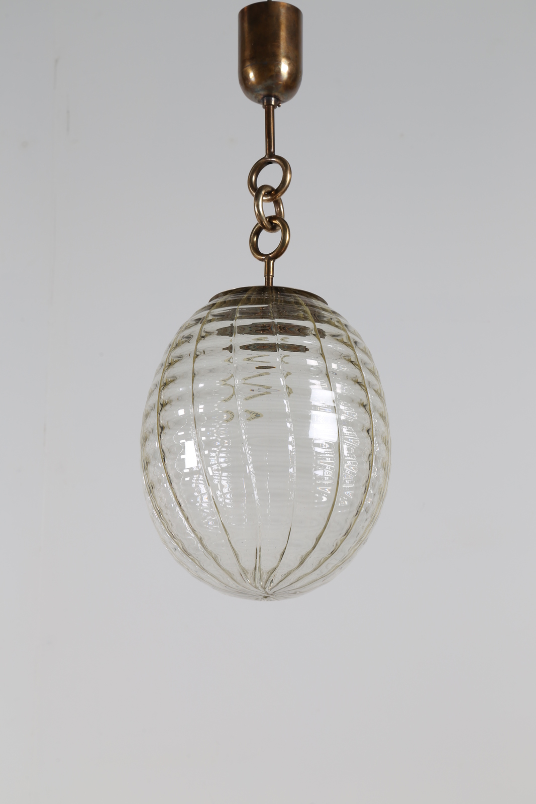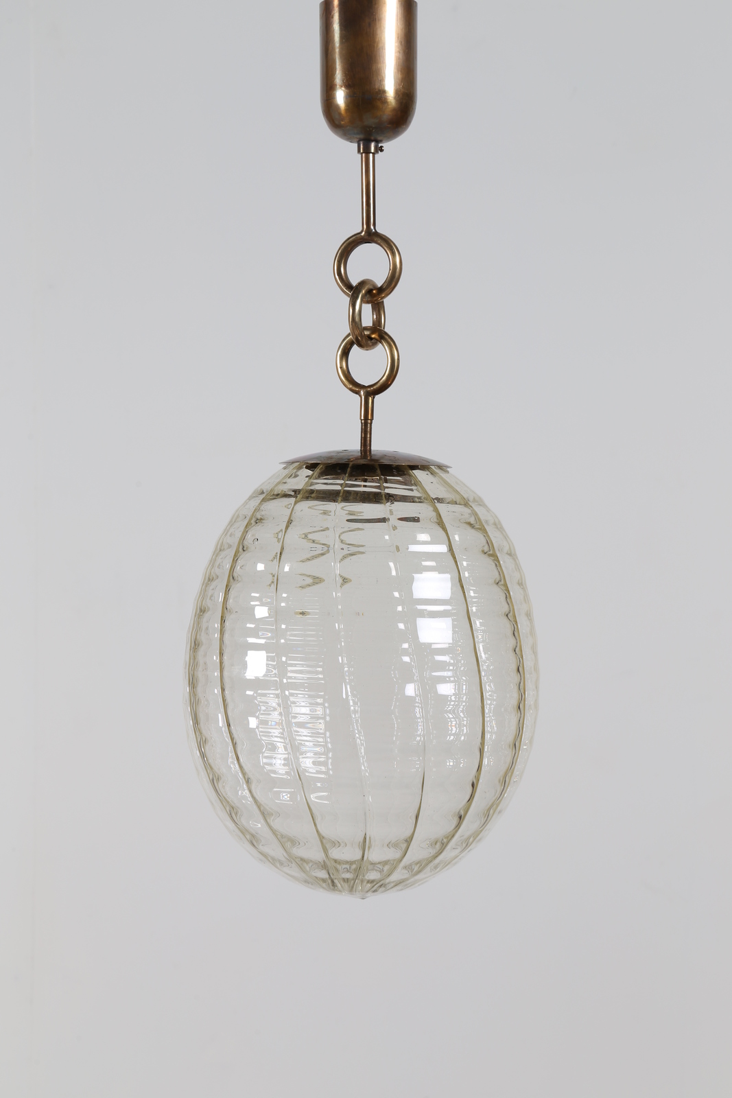 VENINI Lampadario con boccia in vetro trasparente cordonato e struttura in ottone. Prod. Venini anni 1940 . Vetro e ottone. Cm 30,00 x 74,00 x 30,00. anni 40