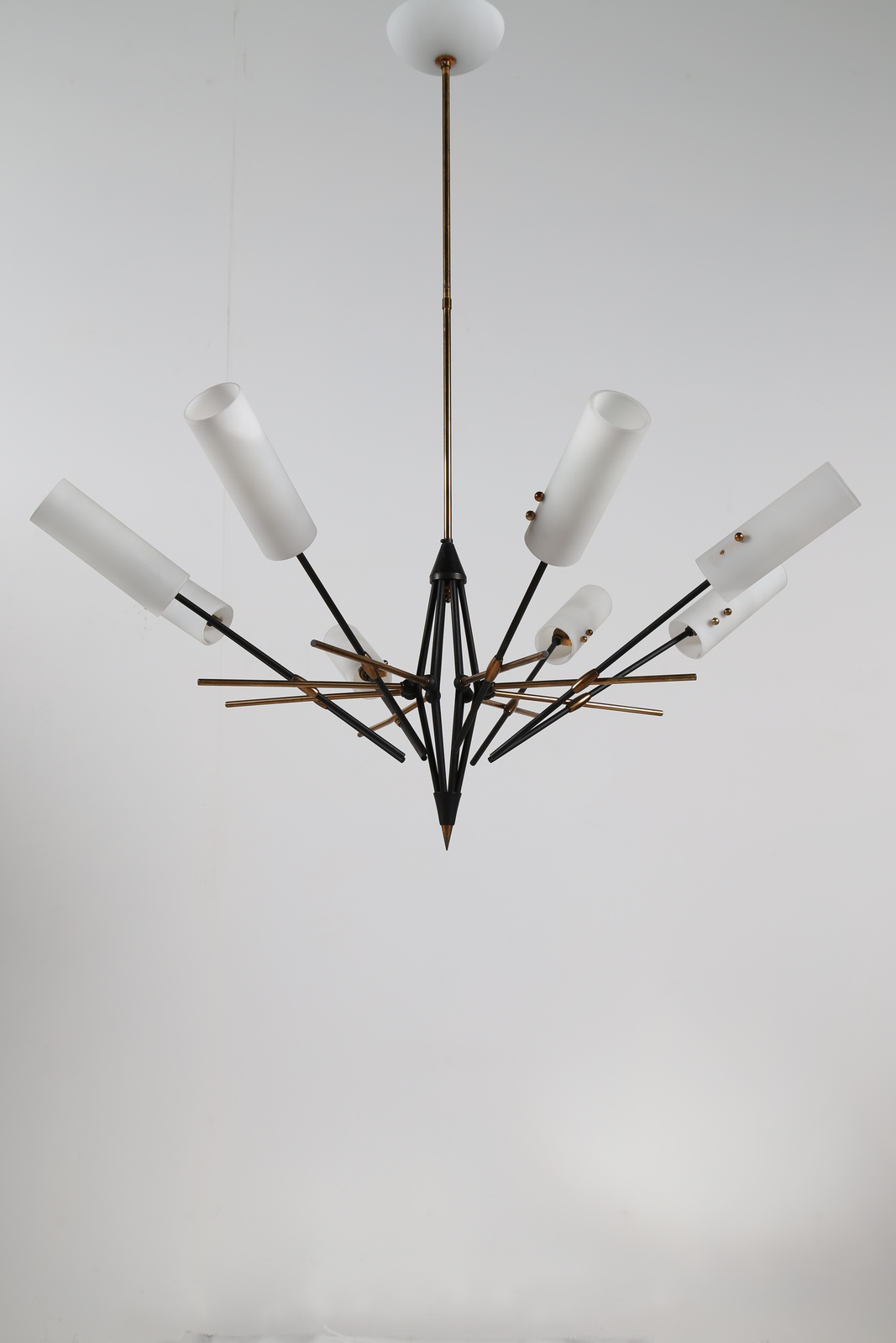 STILNOVO Lampadario in ottone, metallo laccato con vetro opalino ad otto luci, 1950. Ottone, metallo laccato e vetro opalino. Cm 95,00 x 105,00 x 95,00.