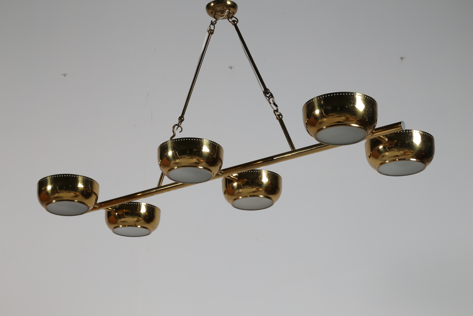 STILNOVO Lampada a sospensione in ottone e vetro opalino sabbiato, 1957 ....