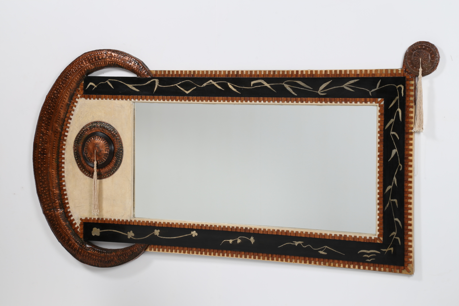 BUGATTI CARLO Grande specchiera in legno pergamena rame sbalzato e vetro,...