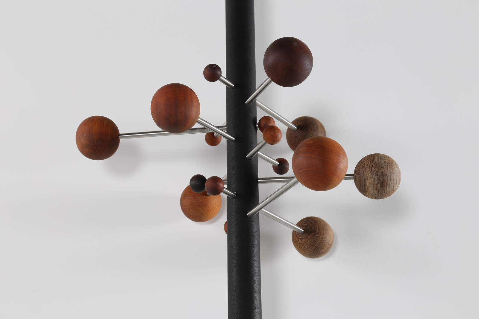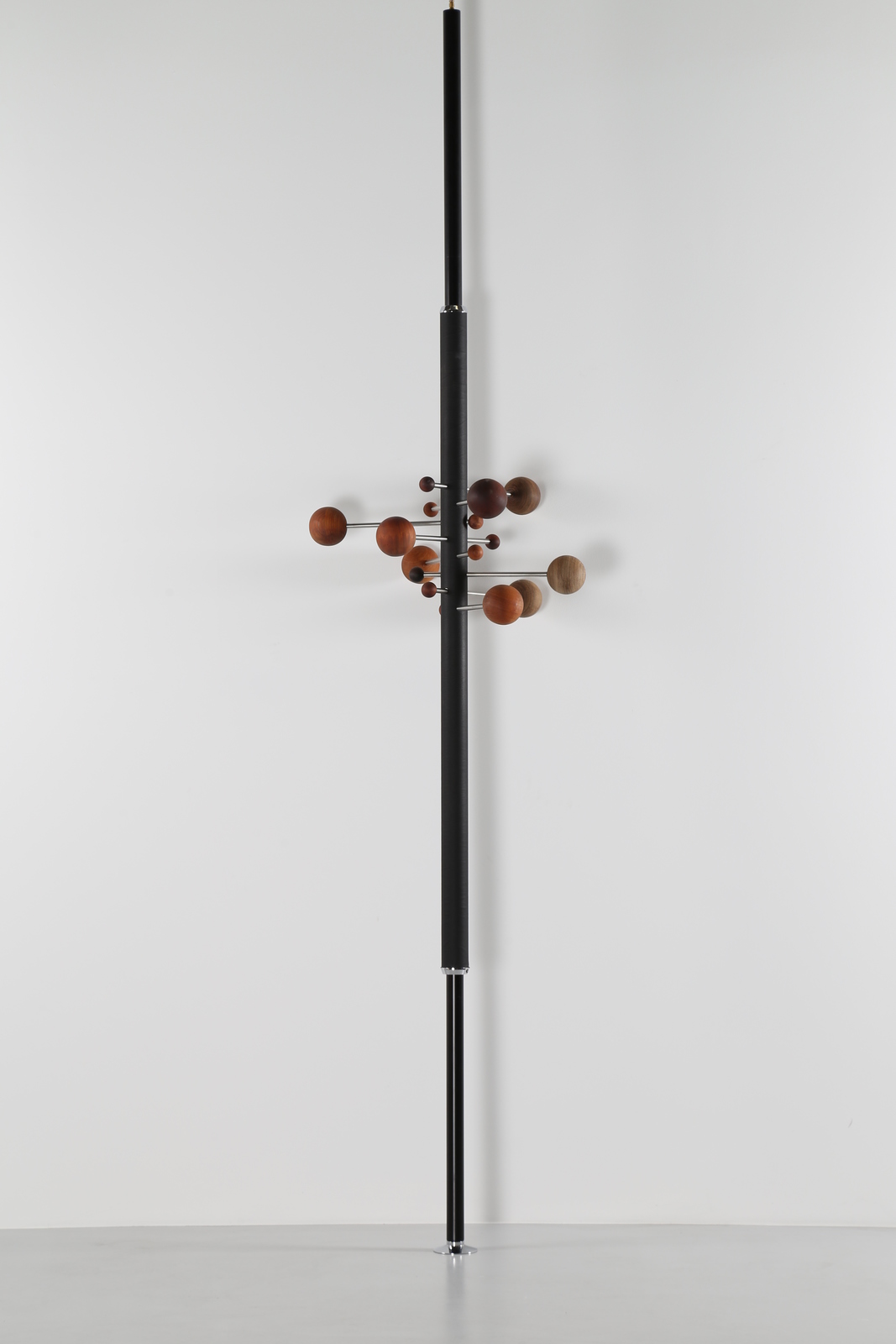 BORSANI OSVALDO (1911 - 1985) Appendiabiti regolabile AT16 alluminio brillantato e acciaio inox spazzolato, sfere in legno massello di faggio per Tecno, 1961. Legno, metallo e pelle. Cm 62,00 x 300,00 x 62,00.