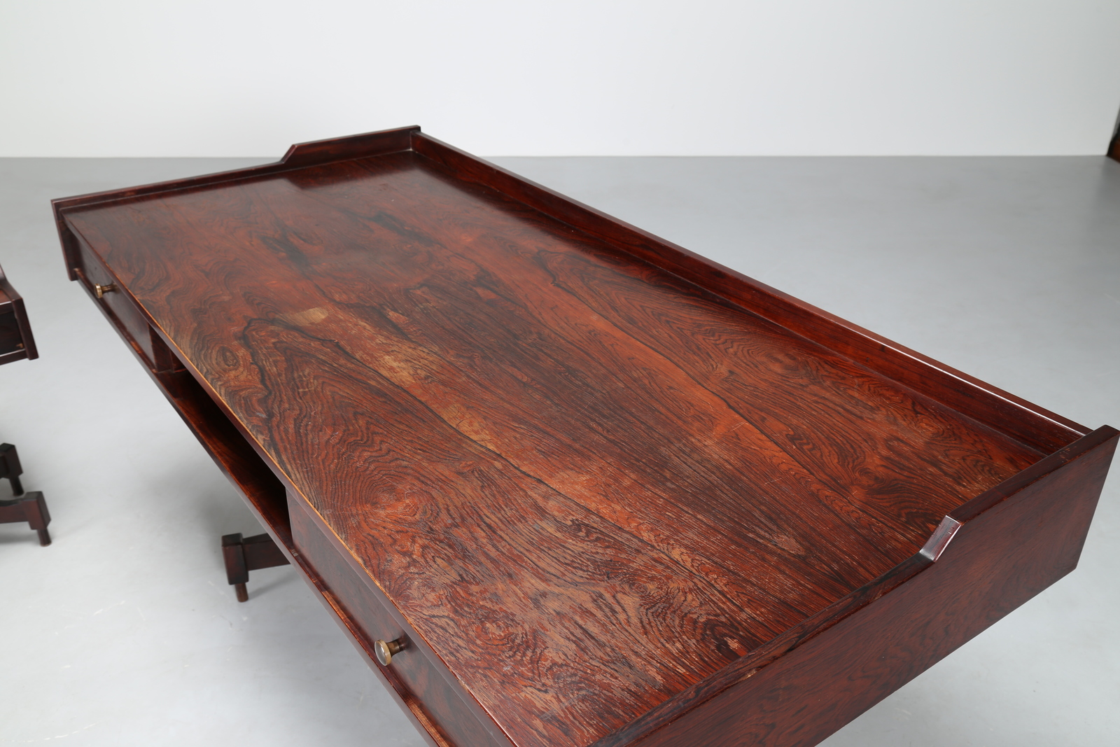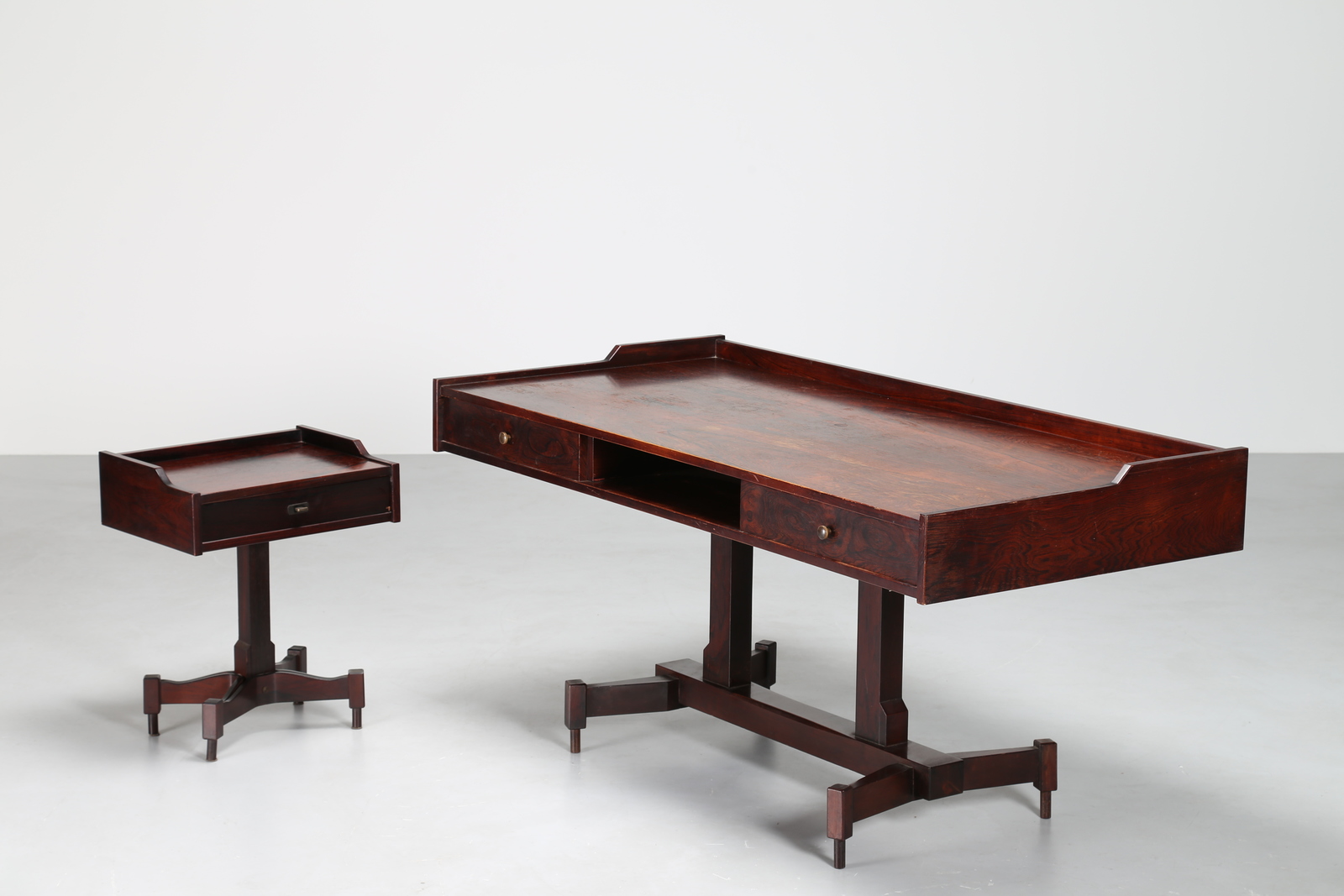 SALOCCHI CLAUDIO (1934 - 2009) Scrivania e comodino in legno di palissandro e ottone, prod. SORMANI, 1970. Legno di palissandro e ottone. Cm 161,00 x 78,00 x 78,00. Misure comodino: 62x50x39