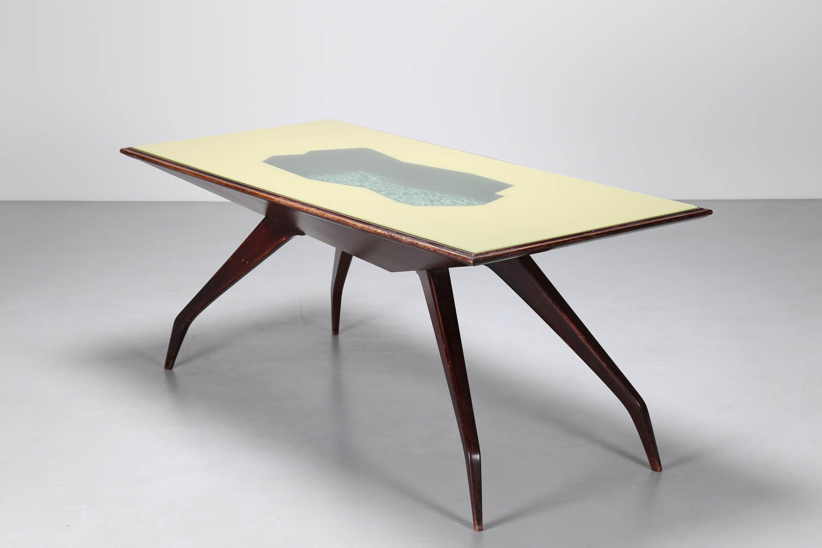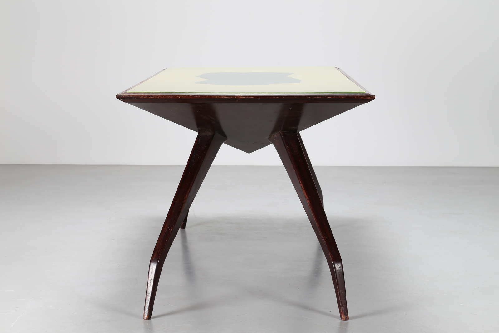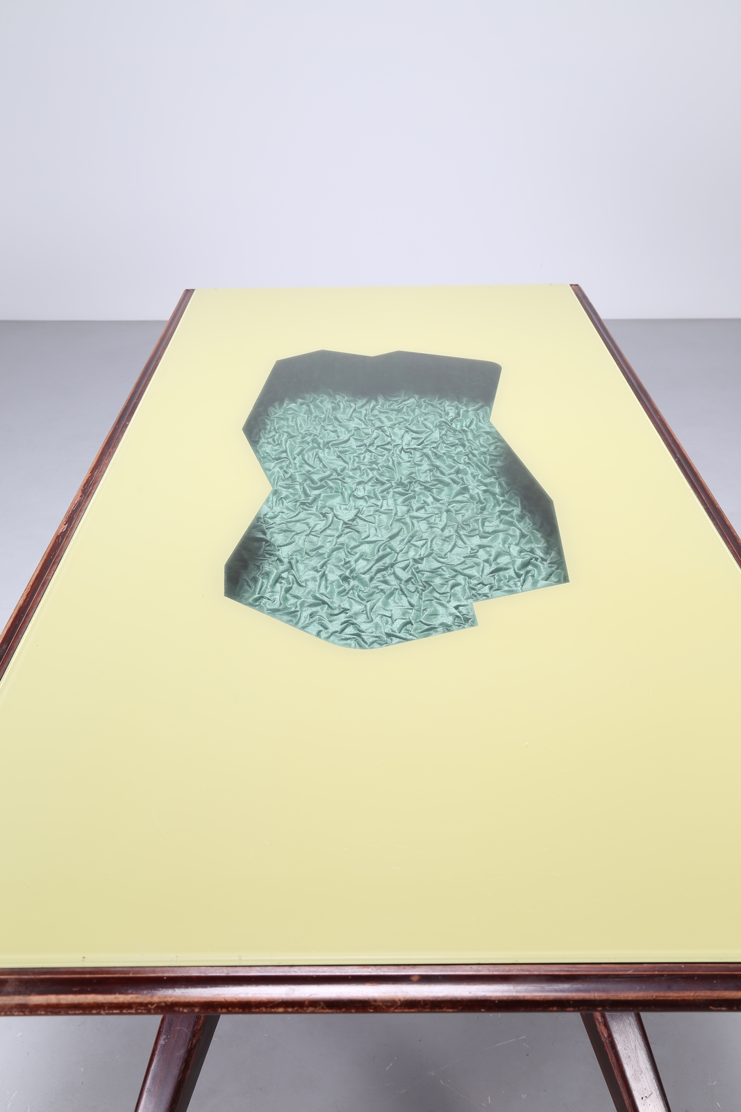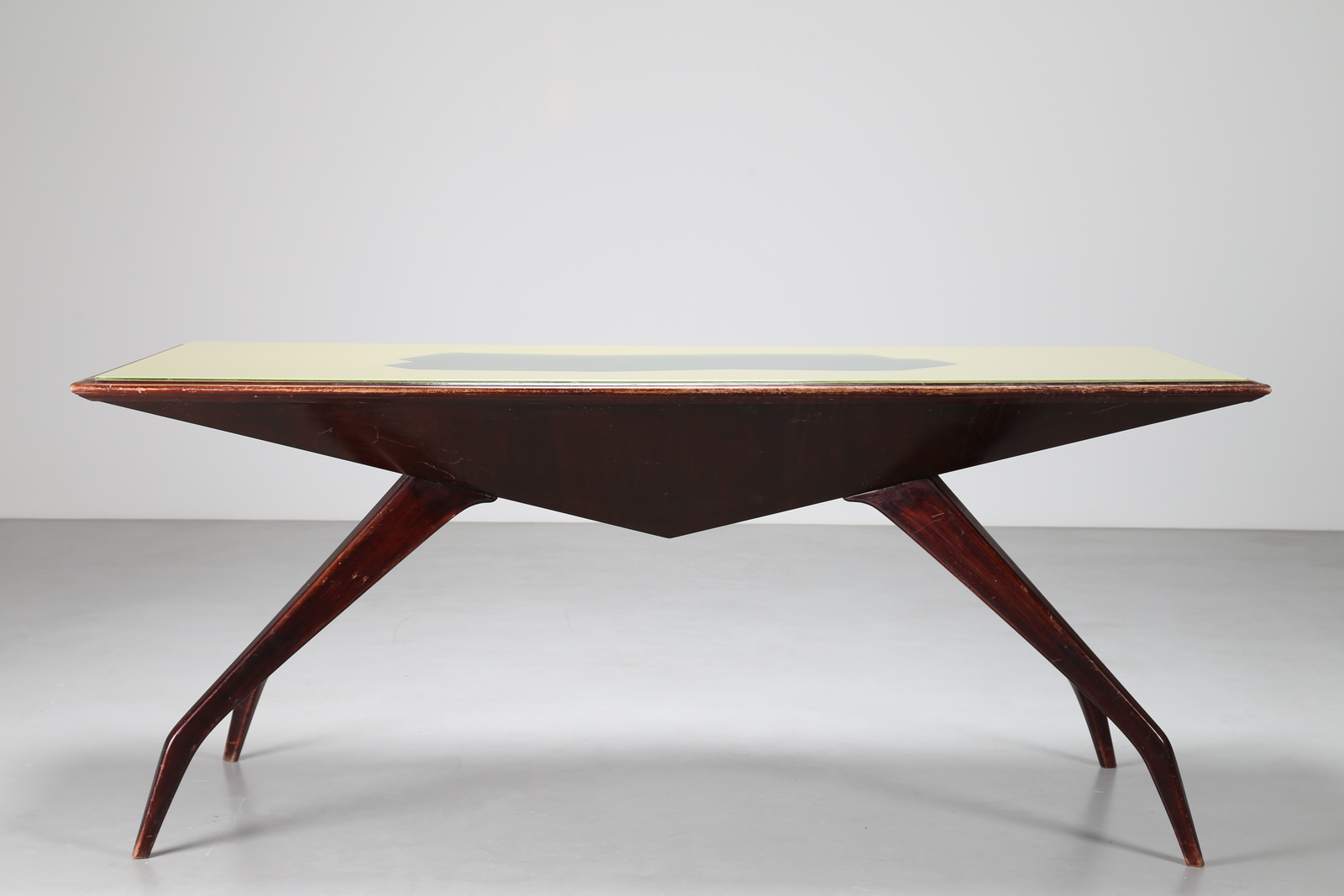 BEGA MELCHIORRE (1898 - 1976) Tavolo in mogano con piano a grancassa foderata in moiret plissettato coperta da vetro opalino oro e trasparente. Il tavolo è parte dell'arredo di una villa anch'essa progettata dall'architetto nel 1948 sui colli bolognesi. Legno di mogano, vetro e tessuto. Cm 186,00 x 80,00 x 86,50.