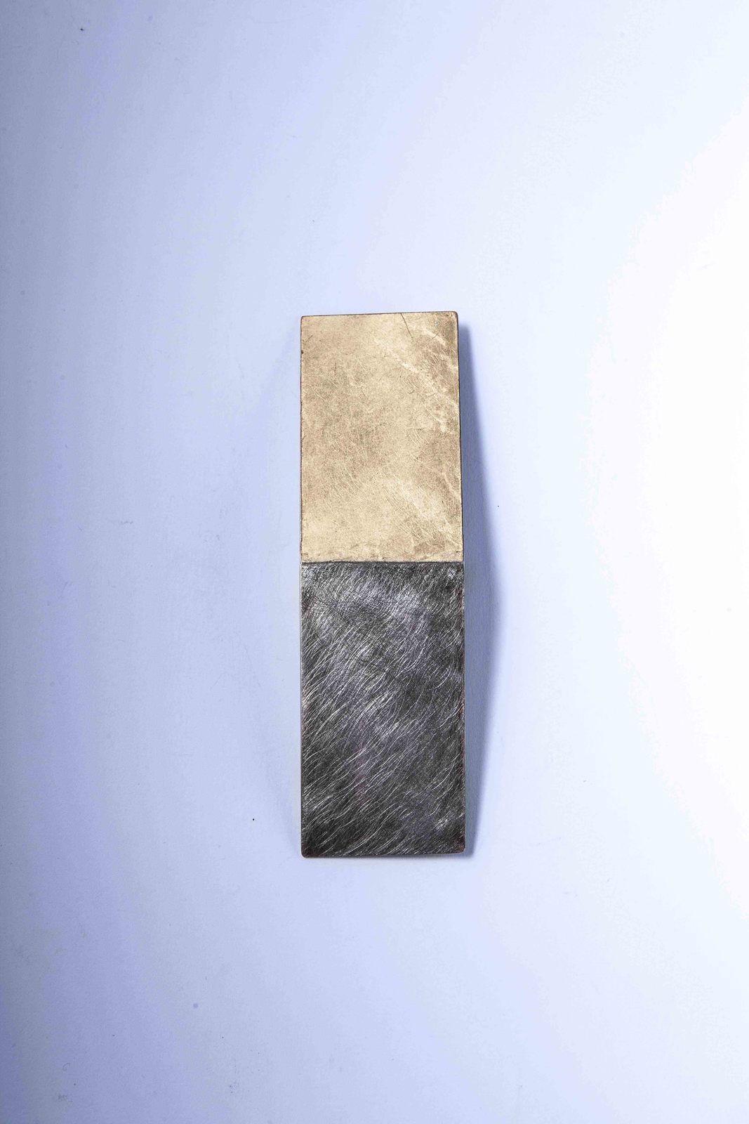 VITA ALBERTA (n. 1956) Spilla Tracce. 2007. Argento satinato e dorato. Cm 16,00 x 4,50. Costruita a mano con lastra satinata e sottoposta a doratura.