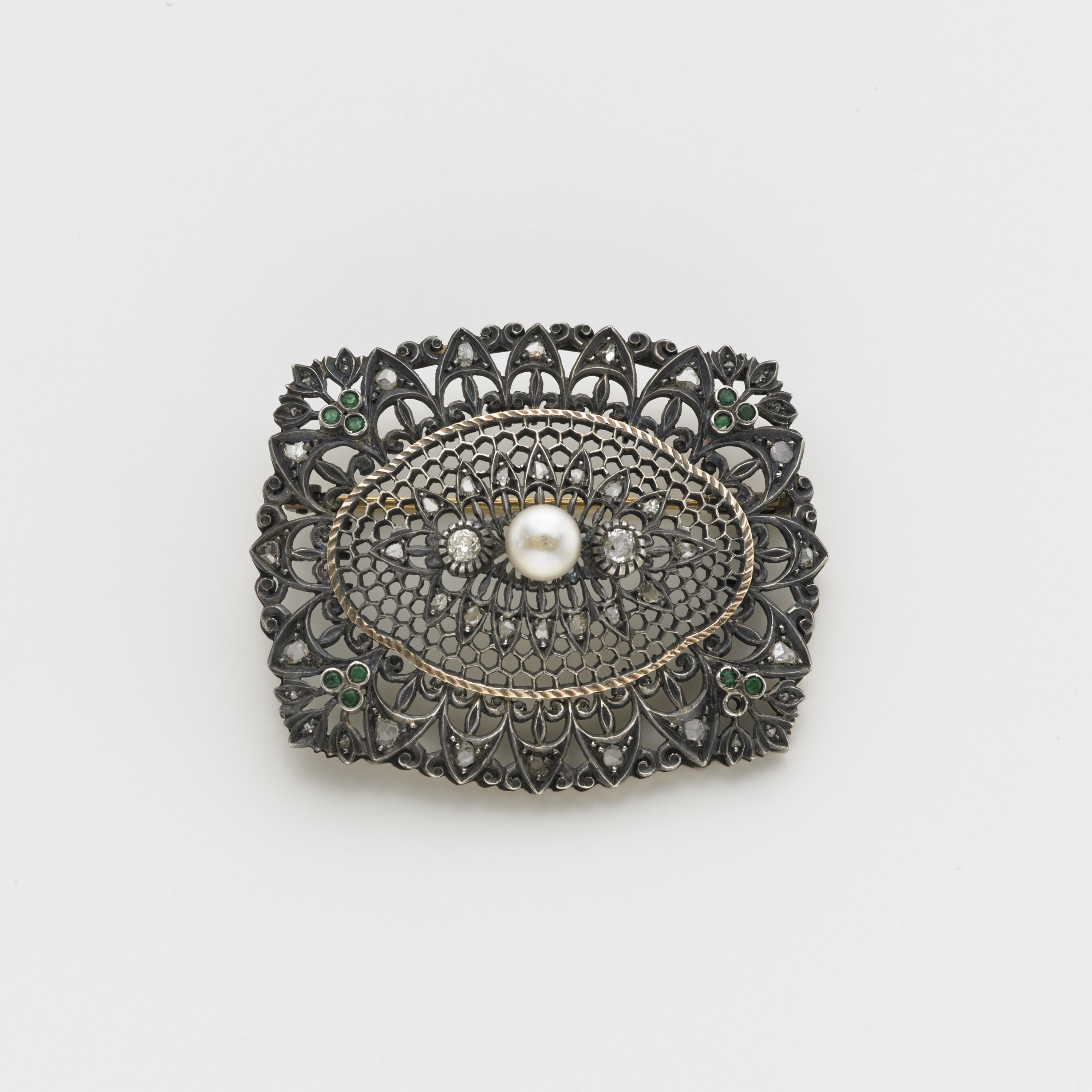 Spilla in oro giallo/rossastro 585/1000 e argento, con diamanti taglio mezza rosetta e vecchio europeo, smeraldi rotondi e perla centrale bianca g. 21,40 Diamond and emerald redish-gold and silver brooch centered by a pearl