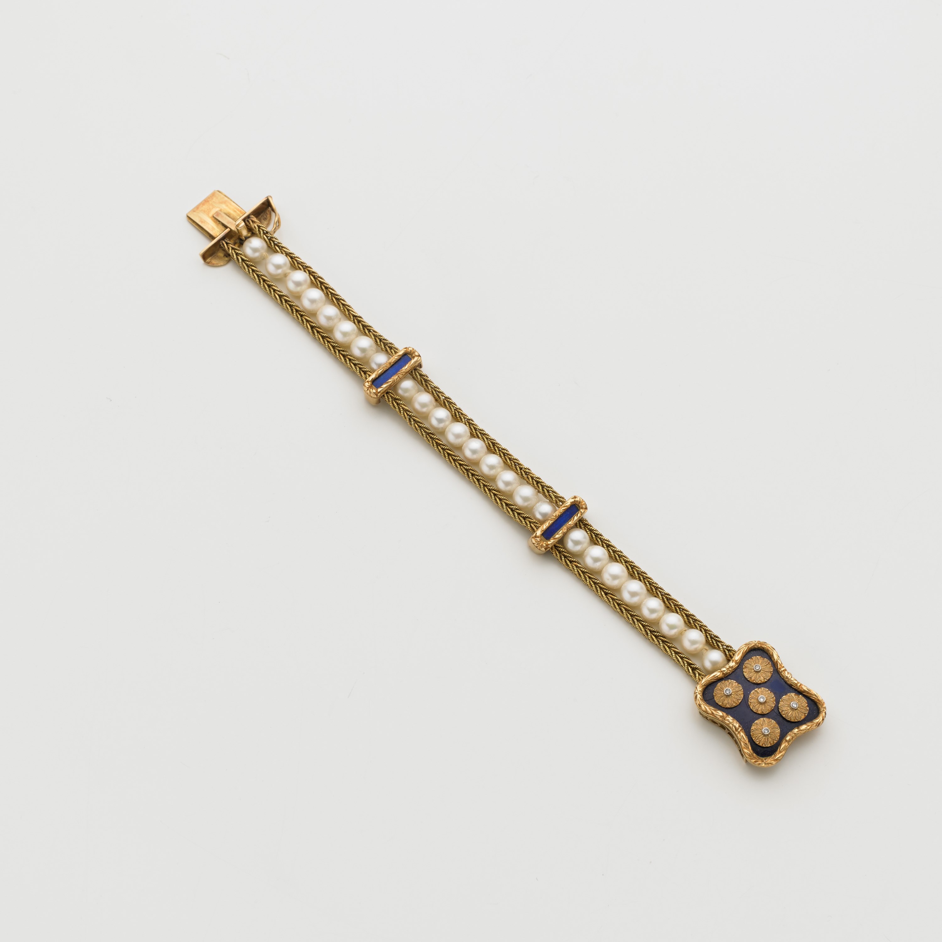 Bracciale in oro giallo con smalti blu e piccole pietre incolori tonde, perle coltivate g. 42,70 lungh. cm 18,50 Enamel, colourless stone and cultured pearl bracelet