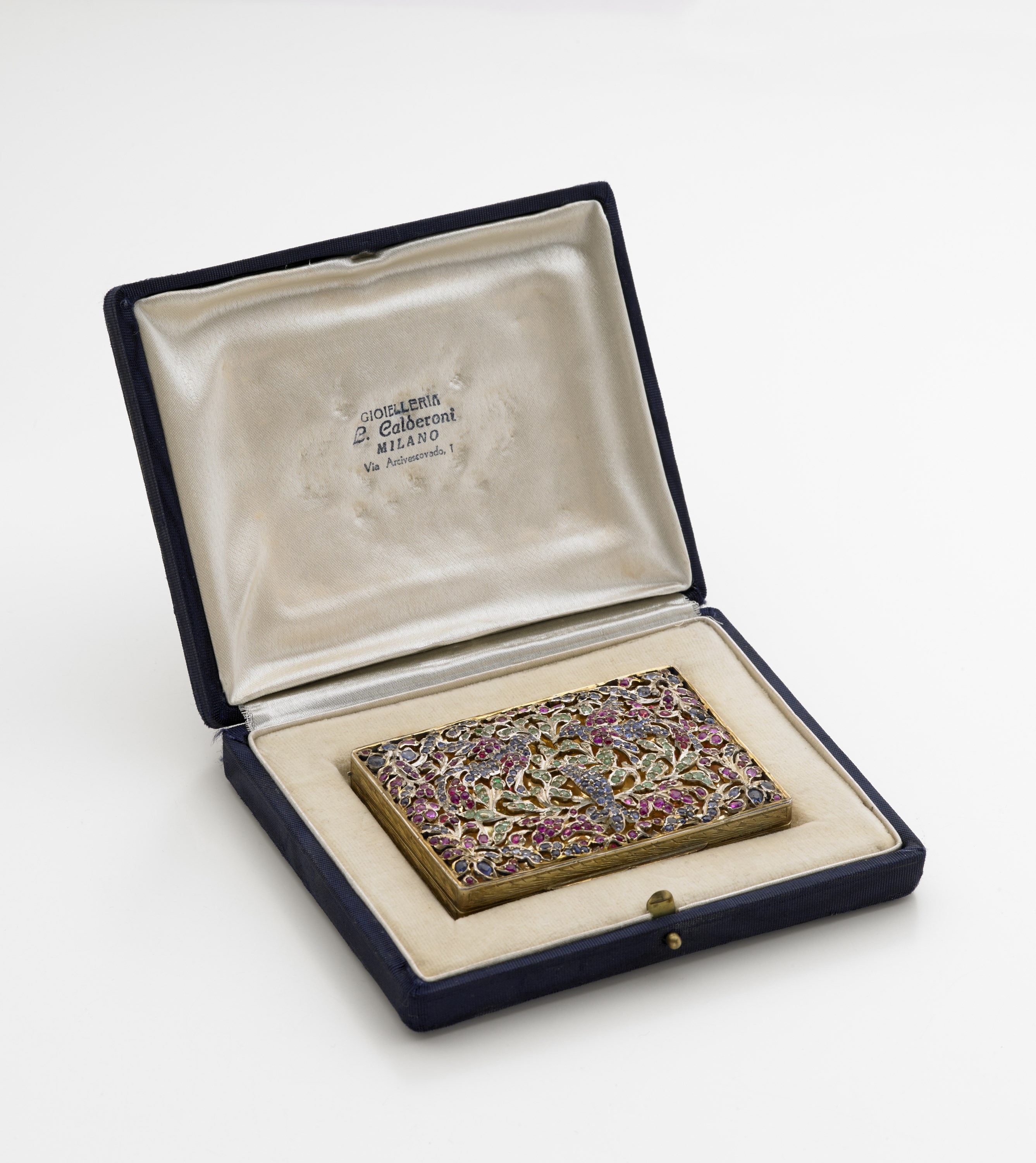 L.CALDERONI MILANO Portacipria in argento e argento dorato con ricamo tempestato di zaffiri rubini e smeraldi g. 115,30 cm 8x5,7. Scatola originale Multi-gem silver and silver gilt compact, with original case