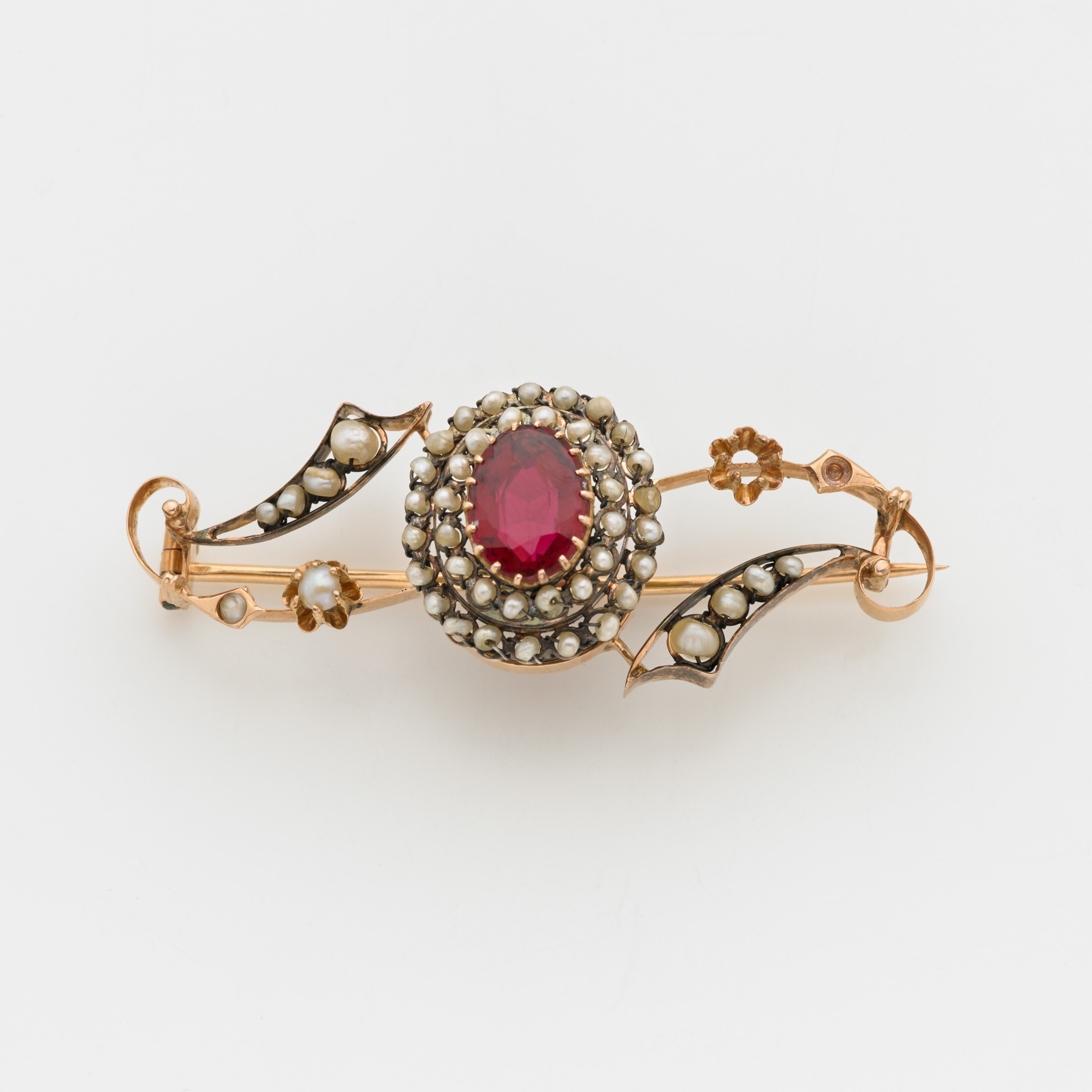 Spilla in oro rosso con microperle ed al centro una doppietta rossa ovale g. 9,20 (mancanze) Red gold brooch with layered centre stone and micropearls (losses)