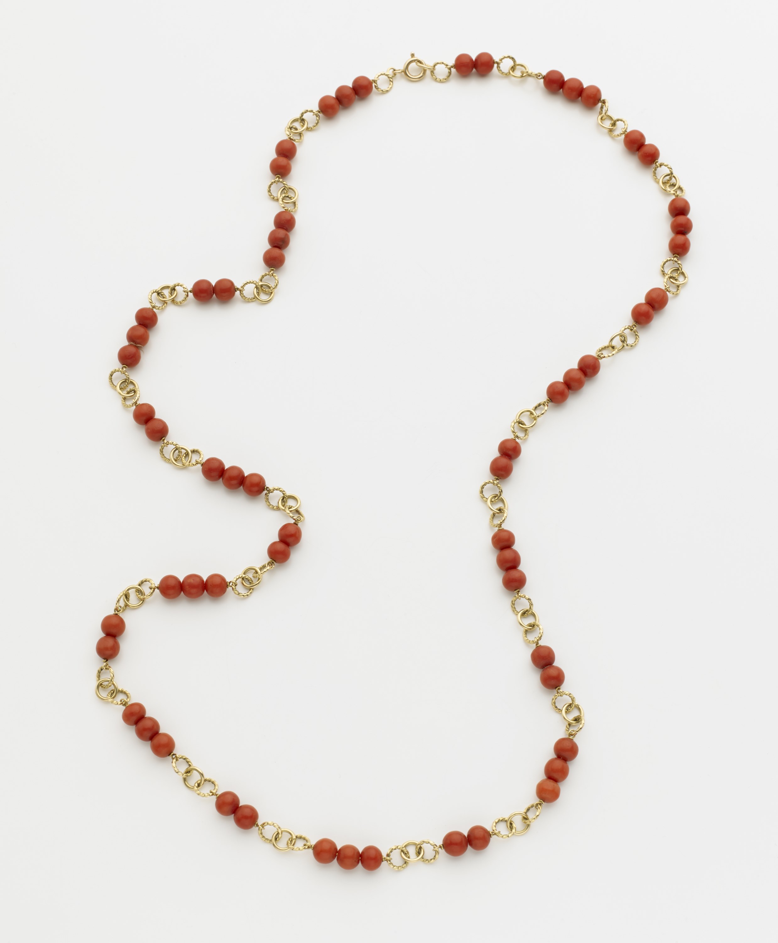Collana ad anelli attorcigliati lisci in oro giallo distanziata da boules di corallo rosso/arancio di mm 7,5 circa g. 56,20, lungh. cm 90 Link chain necklace with orange coral spacers