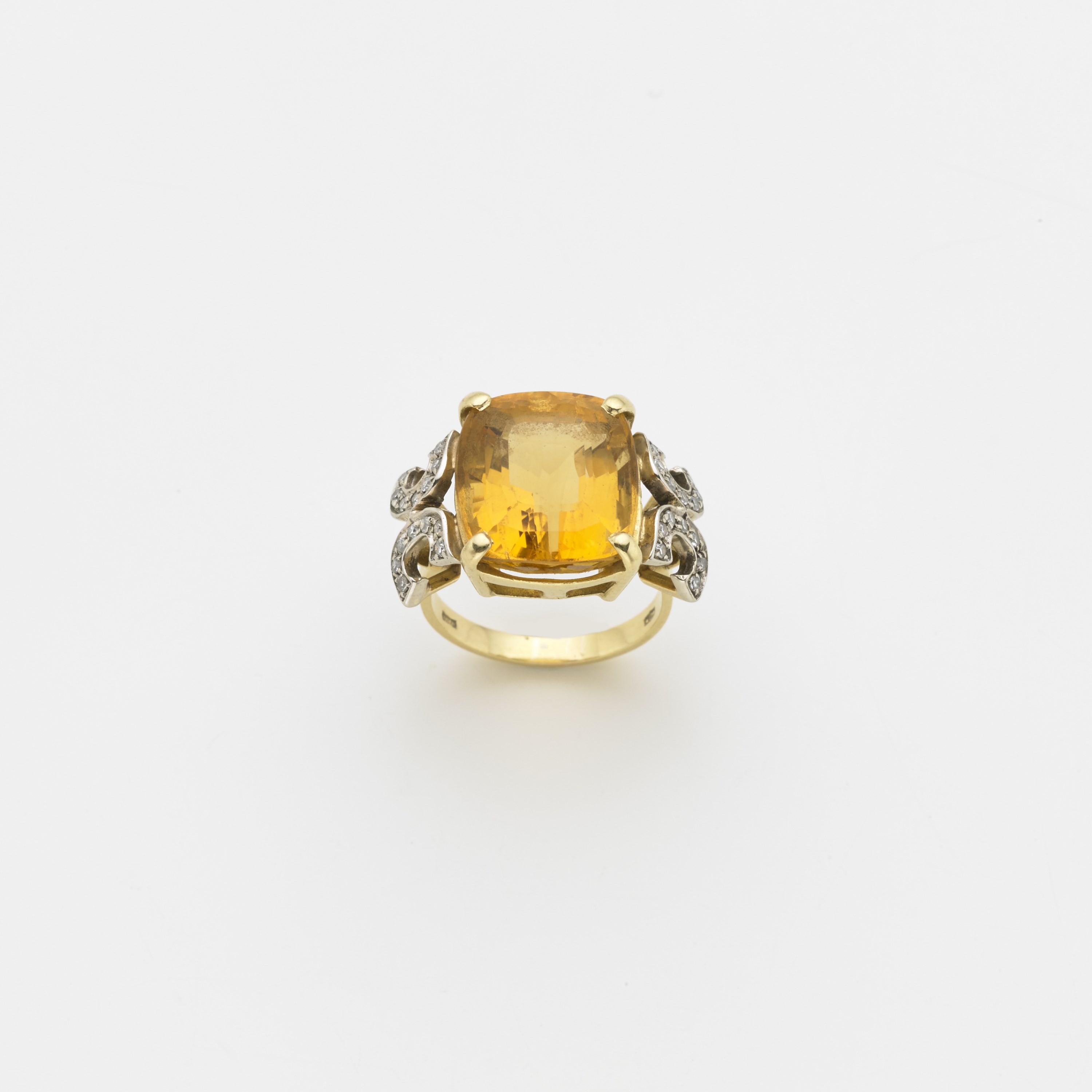 Anello in oro giallo e bianco con piccoli diamanti taglio huit-huit ed al centro un quarzo citrino forma a cuscino taglio composito g. 6,60 misura 9/49 Bi-coloured gold diamond and citrine quartz ring