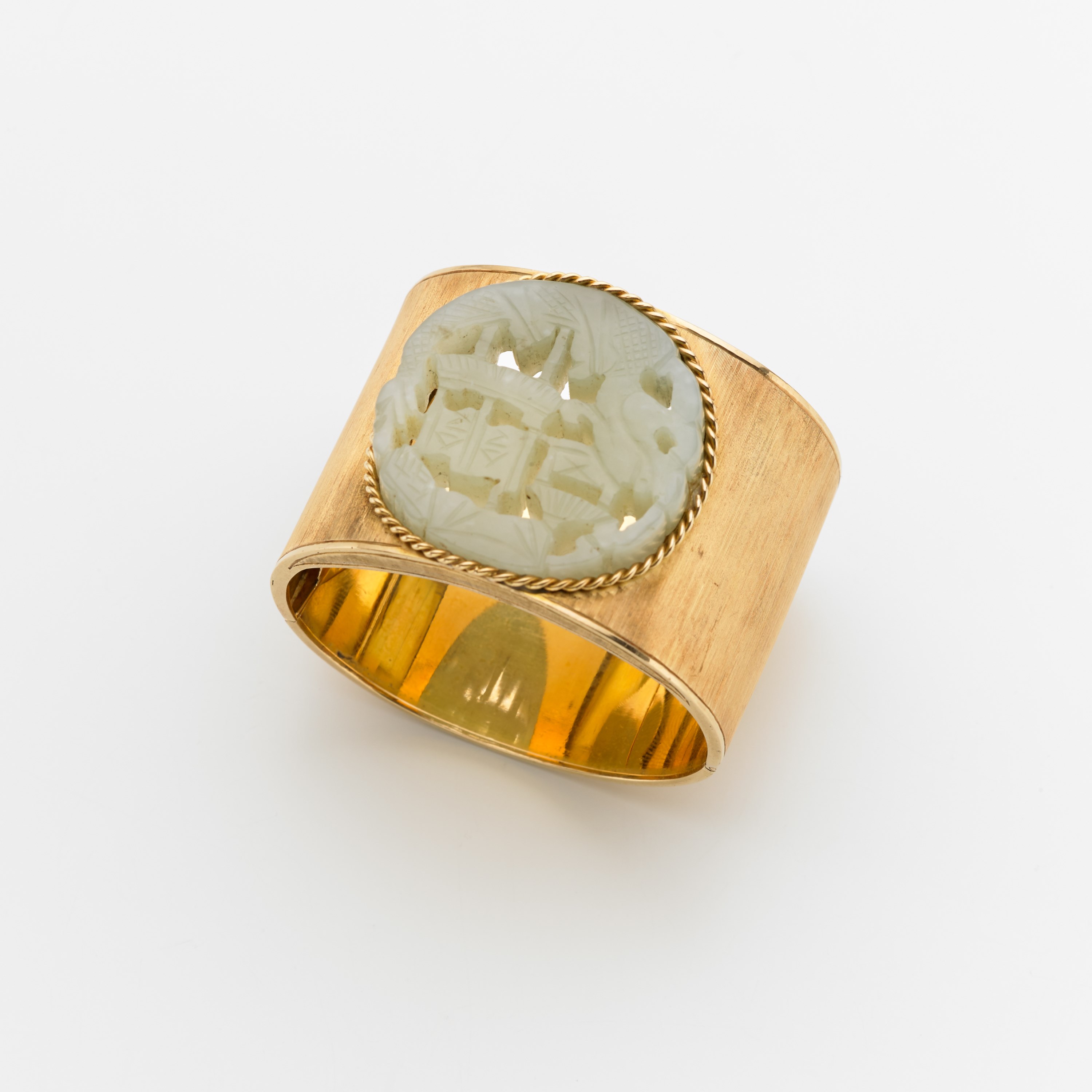 Bracciale rigido lucido e satinato con al centro una giada intagliata g. 76,90 Polished and glazed gold bangle centered by an engraved jade