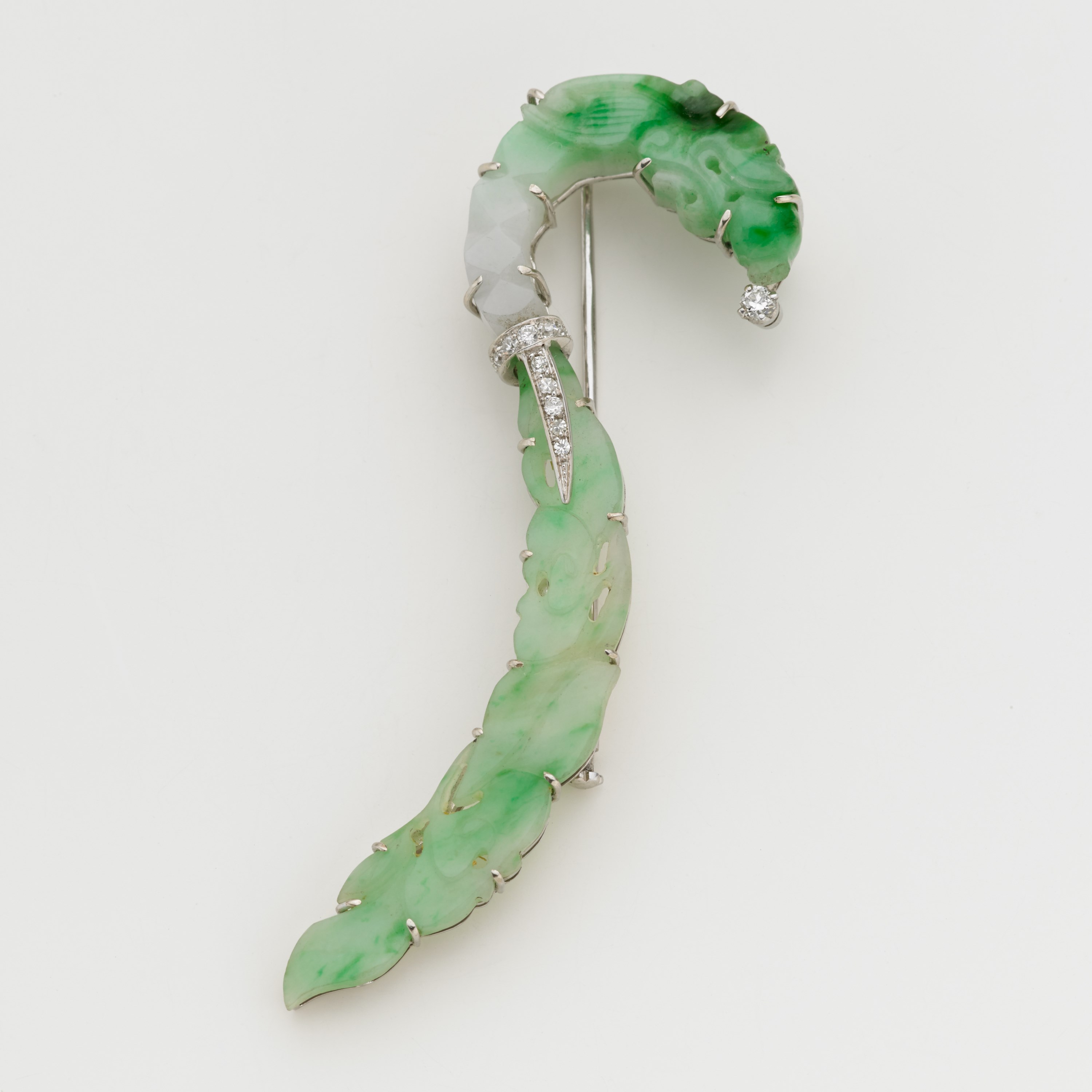 Spilla a forma di drago in oro bianco e giadeite variegata rifinita in...
