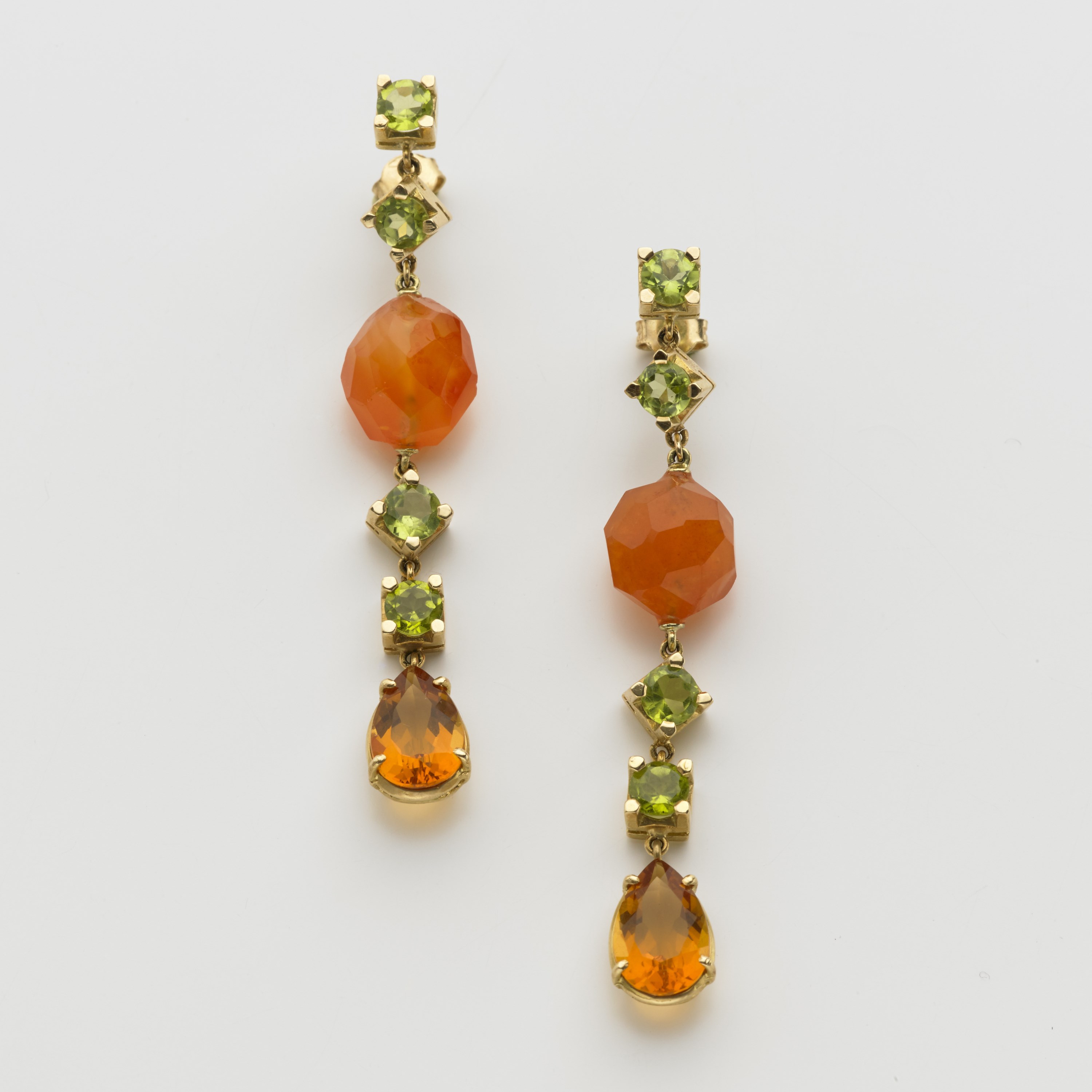 Orecchini pendenti in oro giallo con peridoti verdi, due corniole sfaccettate e due quarzi citrini a goccia a terminarli, lungh. cm 7 circa g. 14,40