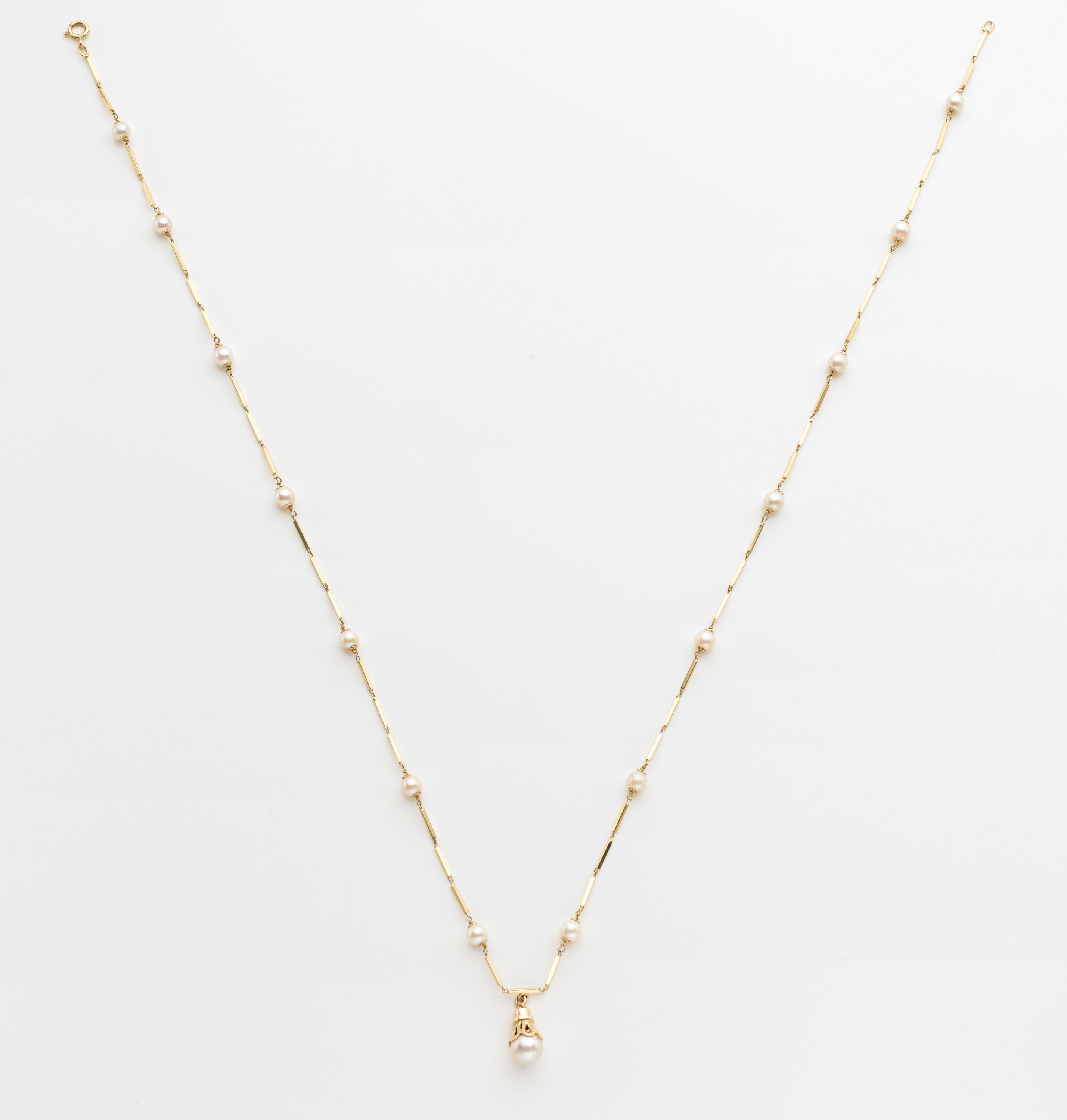 Collana a bacchette in oro giallo alternate a perle coltivate ed al centro una perla pendente mm 9,50, g. 20,40 lungh. cm 70 Cultured pearl and gold sautoir