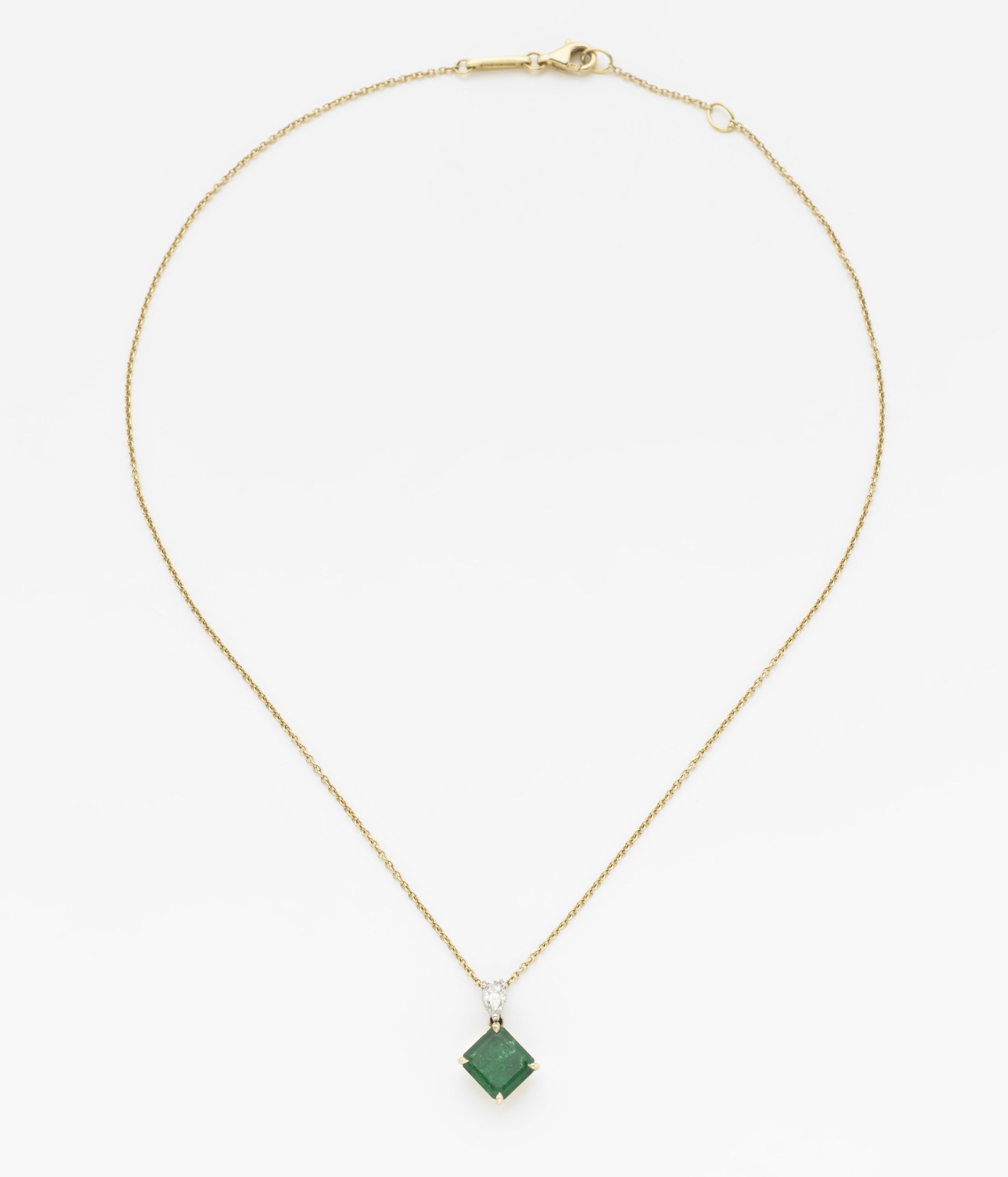 PEDERZANI Catenina e ciondolo con smeraldo ct.1,50 circa e piccolo diamante, catenina CANTAMESSA, lungh. cm 38.50, g.4,30 Golden chain with emerald and diamond pendant