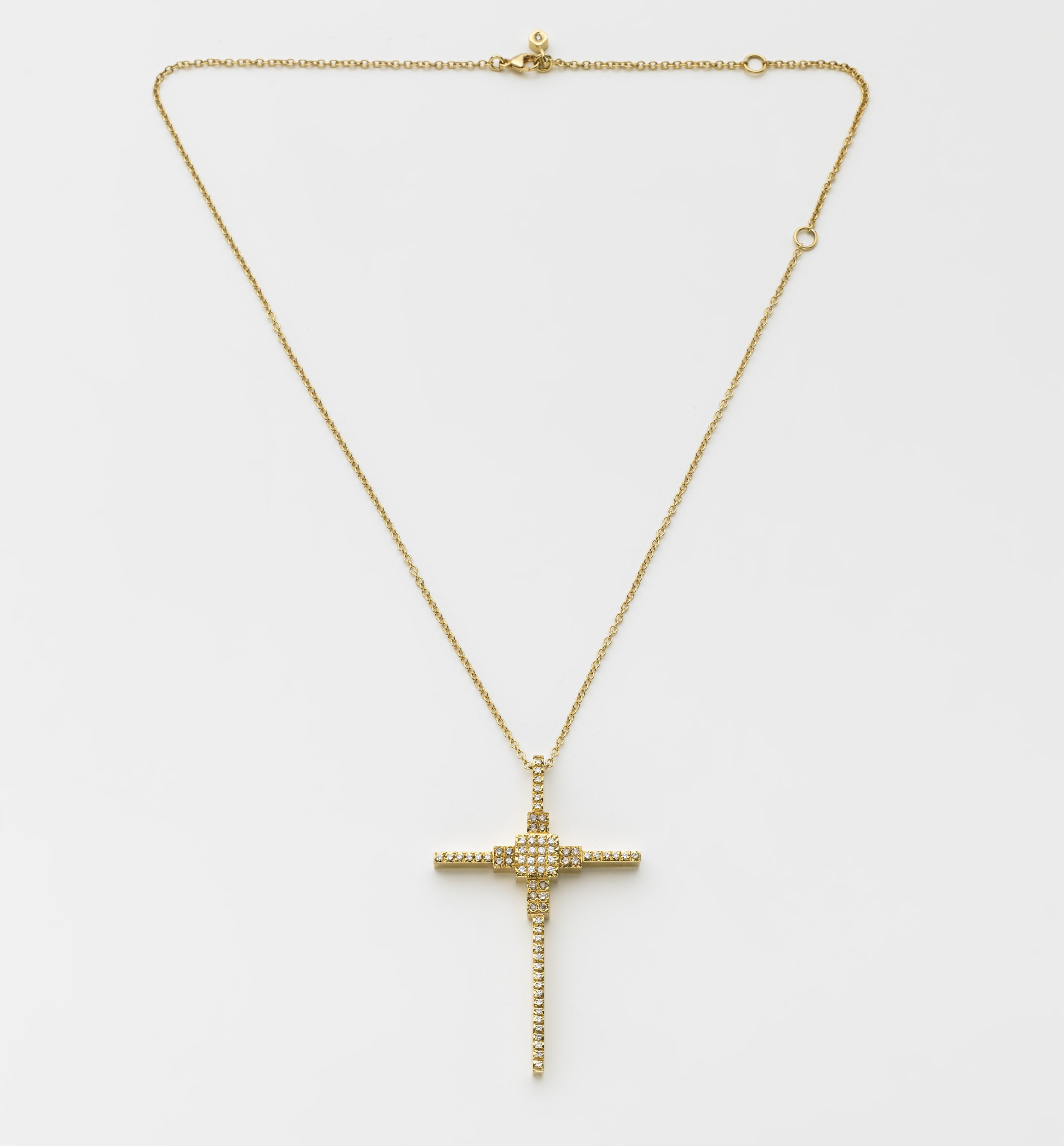 Catenina con croce pendente in oro giallo, diamanti rotondi incolori e brown...