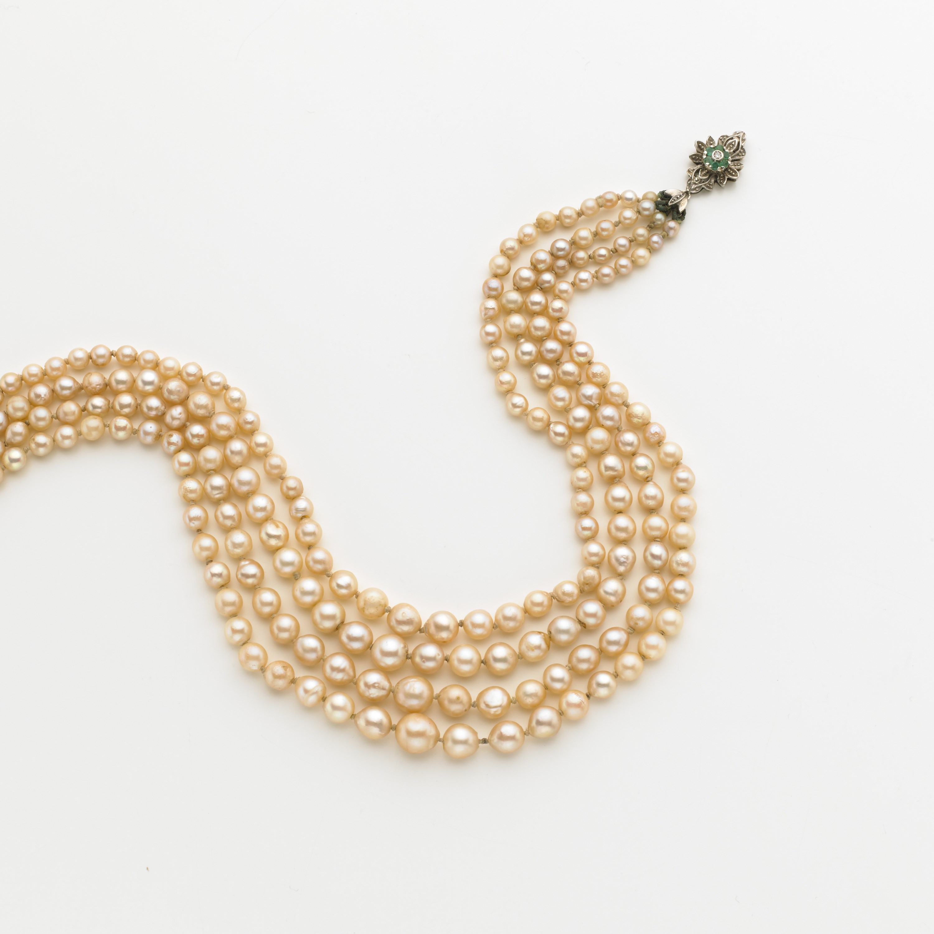Collana a quattro fili scalati di perle coltivate, forma da tonda ad ovale chiusura in oro bianco con smeraldi e piccola pietra incolore, primo filo interno lungh. cm 38 complessivi g. 62,40 Four strand cultured pearl necklace with white gold emerald and colourless stone clasp