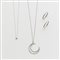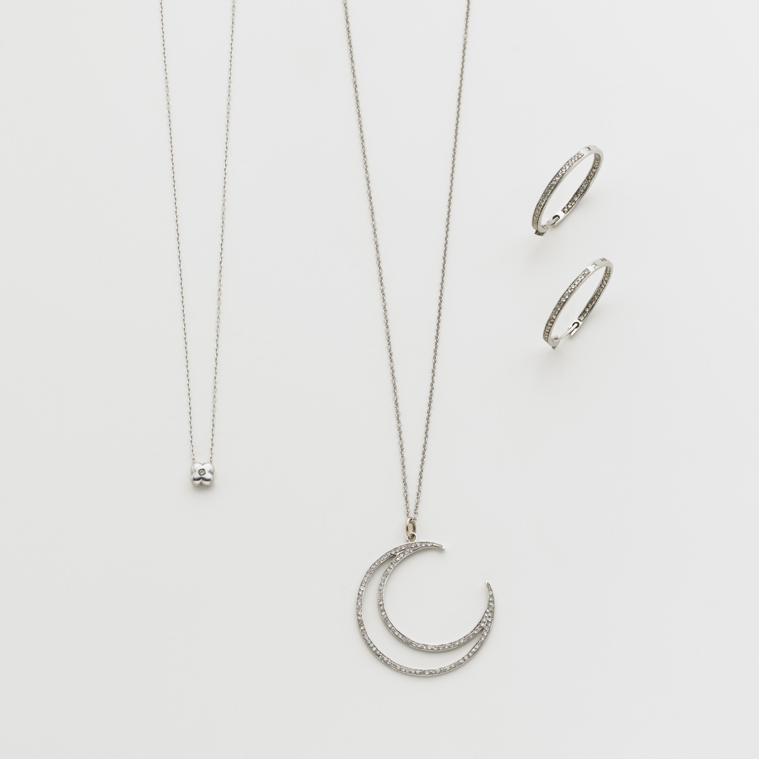 Demi-parure in oro bianco e diamanti composta da orecchini ad anello e catenina con pendente a luna crescente lungh.cm.44,00. unita a una collana con fiorellino e diamante al centro lungh. cm.41,00. Complessivi g. 18,20 Diamond white gold set of jewellery comprising a chain with pendant, a ring and earings and a different necklace with diamond flower pendant