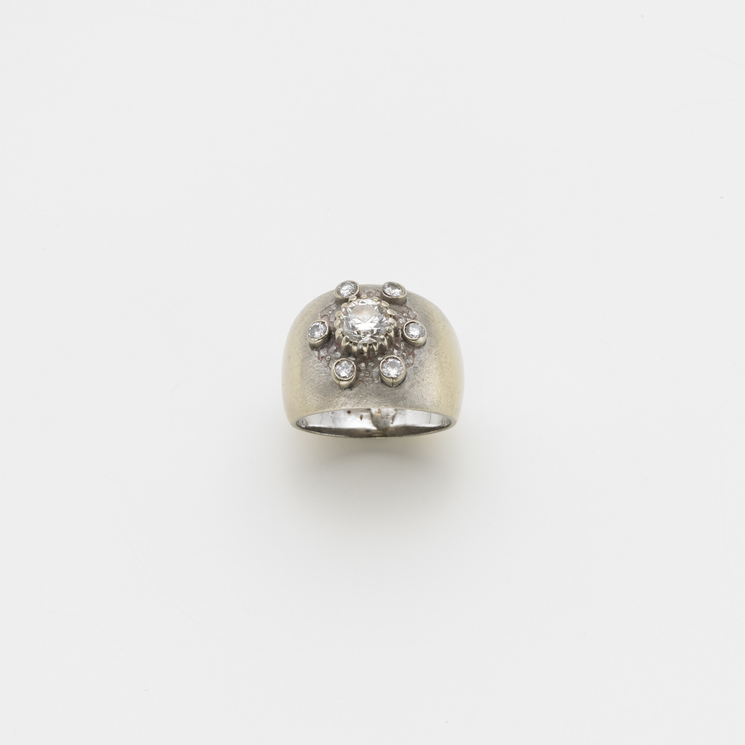 Anello in oro bianco con diamante centrale rotondo taglio a brillante di ct 0,50 circa e contornato da altri sei pi˘ piccoli g. 7,40 misura 7/47 White gold band centered by a diamond with diamond surround