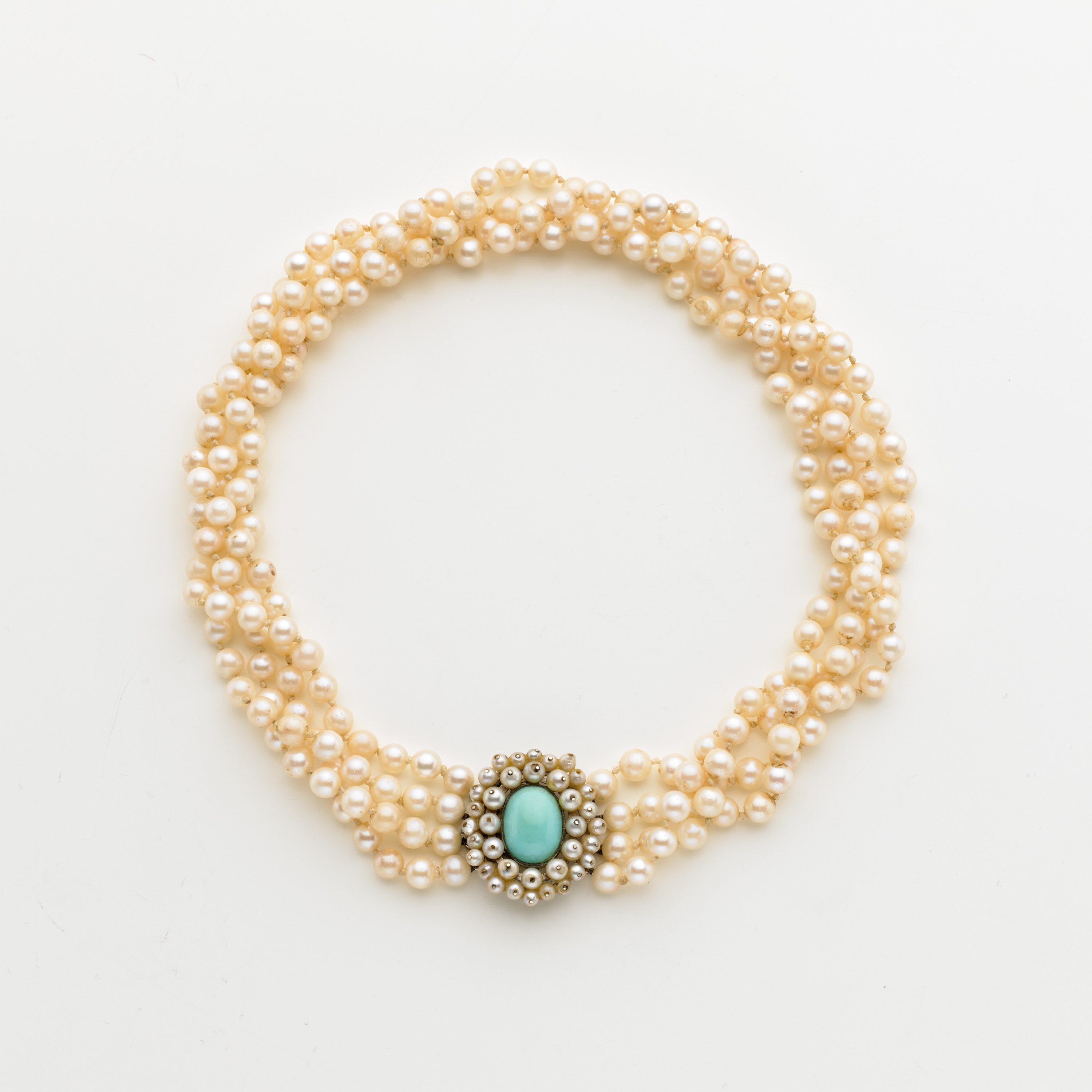 Collana a quattro fili di perle coltivate di mm 6/6,5, chiusura in oro bianco con turchese ovale cabochon contornato da due fili di perle g. 90,30 lungh. primo filo interno cm 45 Four strand cultured pearl necklace with turquoise and pearl white gold clasp