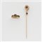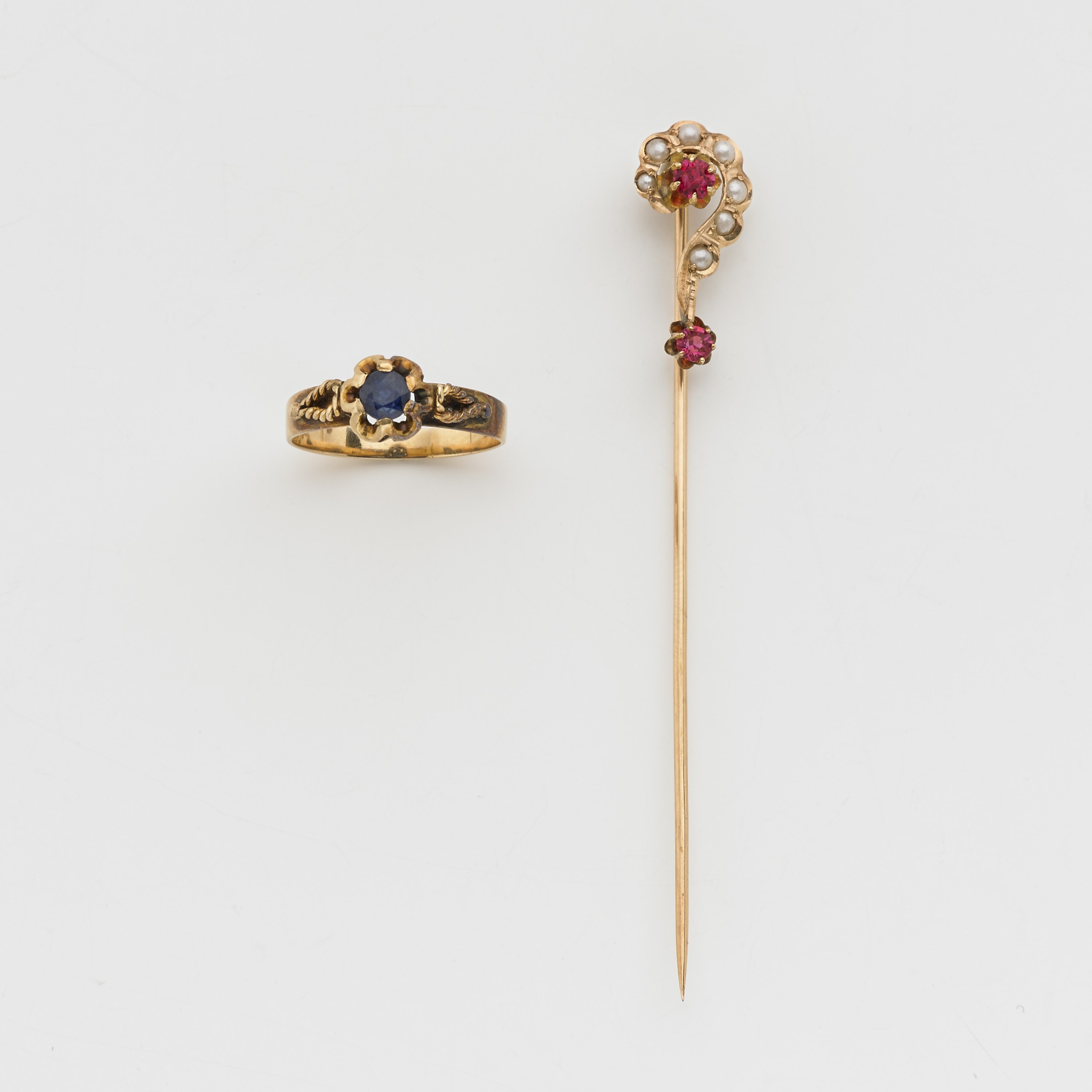 Lotto composto da spillone e anello in oro rosso, zaffiro, rubino e microperle g. 4,00 Lot comprising a tie- pin and a sapphire ruby and micropearl ring