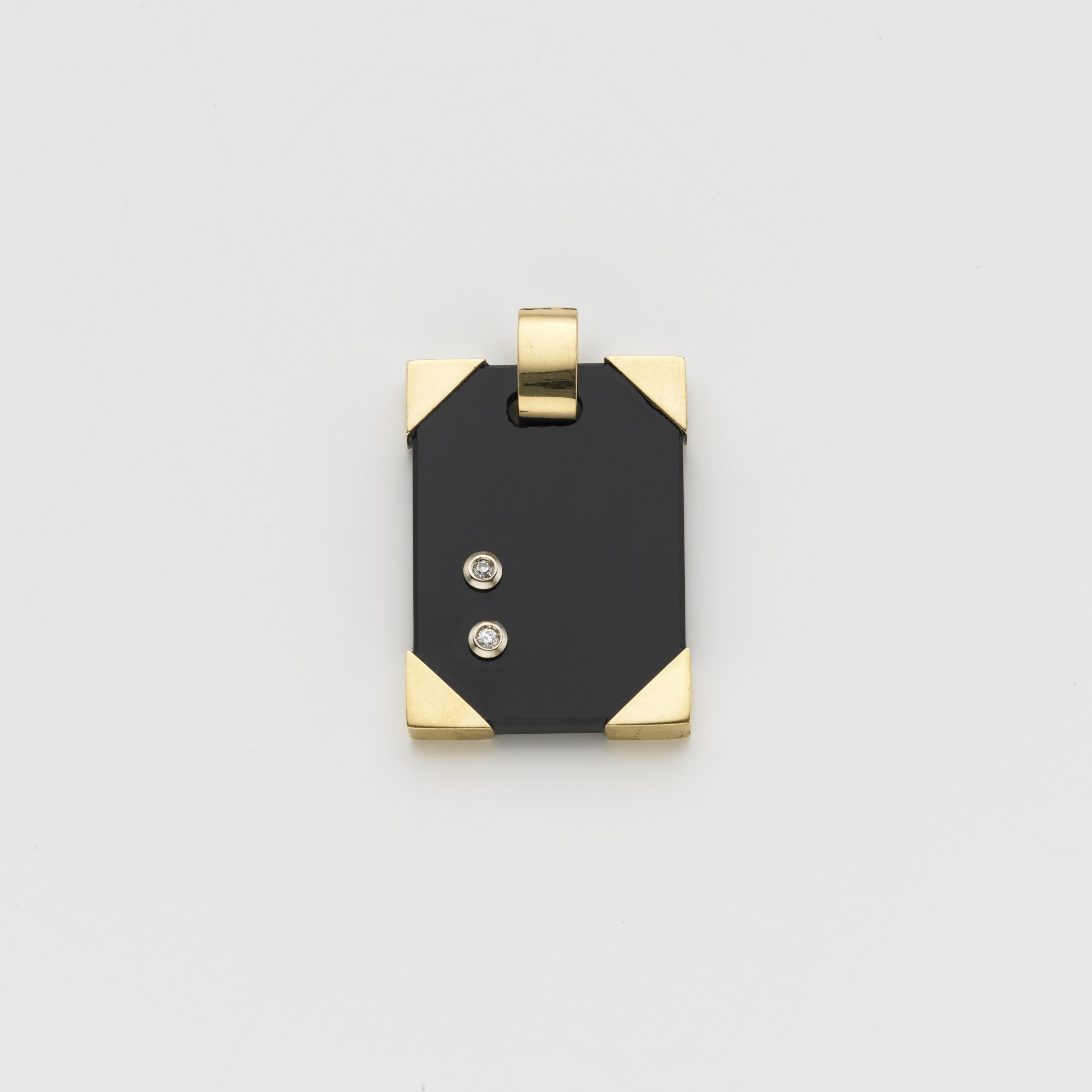 Pendente rettangolare in onice rifinito in oro giallo con incastonati due piccoli diamanti rotondi taglio a brillante g. 12,10 Onyx, diamond and gold pendant