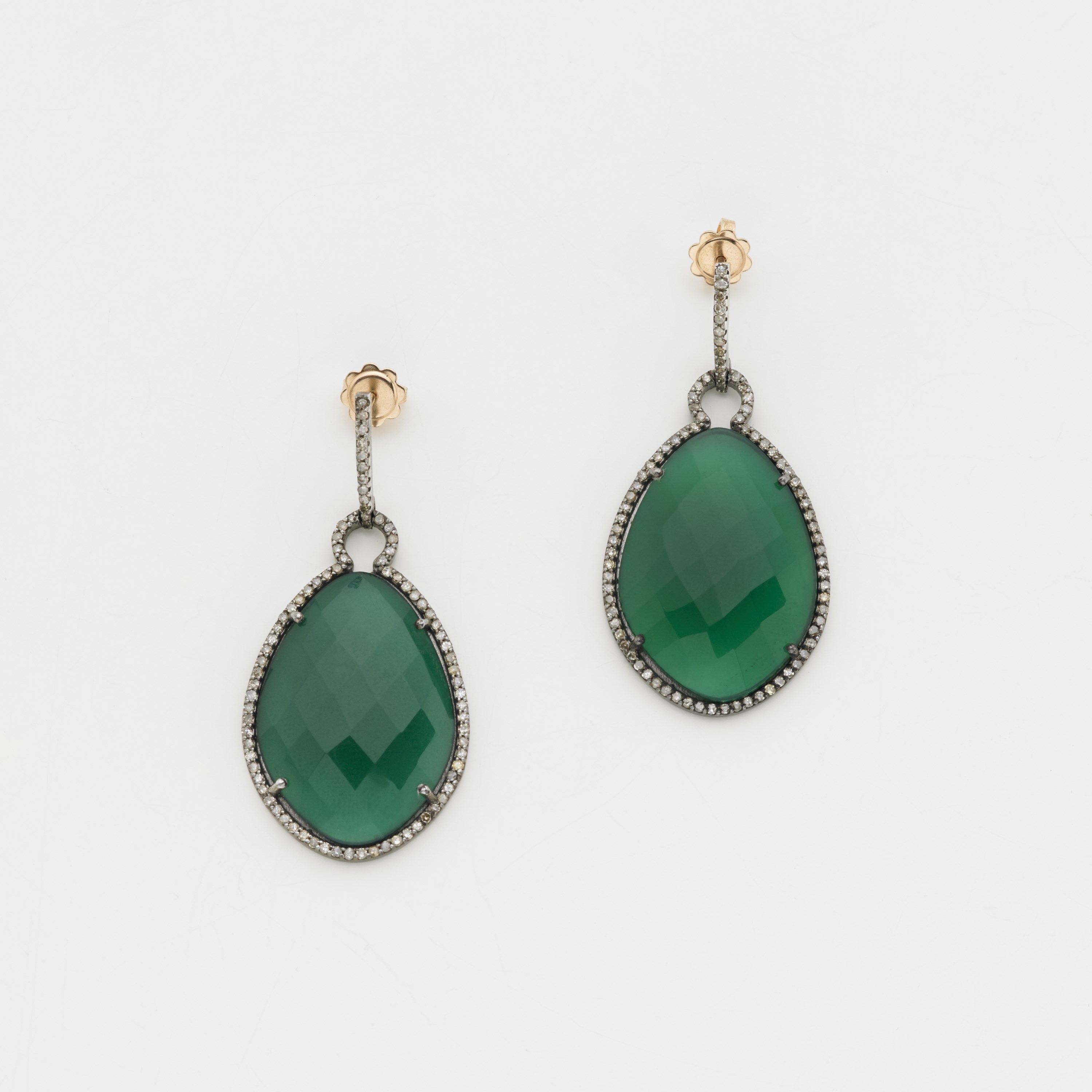 Orecchini pendenti in oro e argento con agate verdi irregolari sfaccettate rifinite con diamanti rotondi g. 17,20 lungh. cm 5 circa Irregular agate silver and gold ear pendants with diamond surround