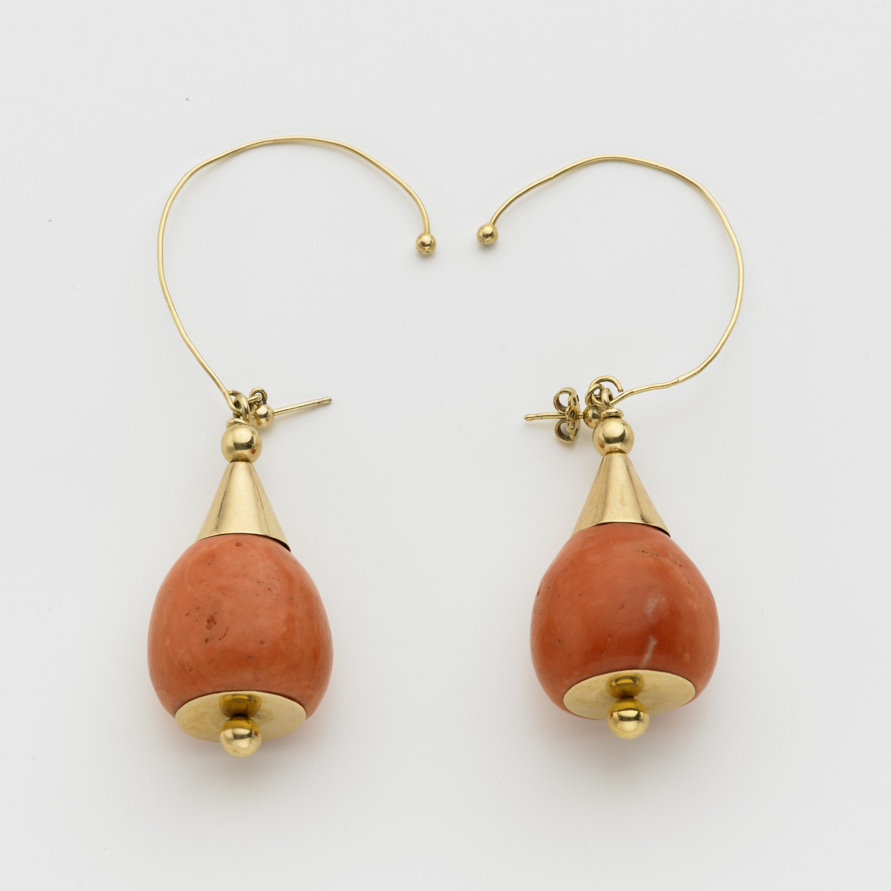 Orecchini pendenti in oro giallo con due coralli arancioni a barilotto irregolare diam. cm 2,50 circa, g. 67,20 Coral and gold ear pendants