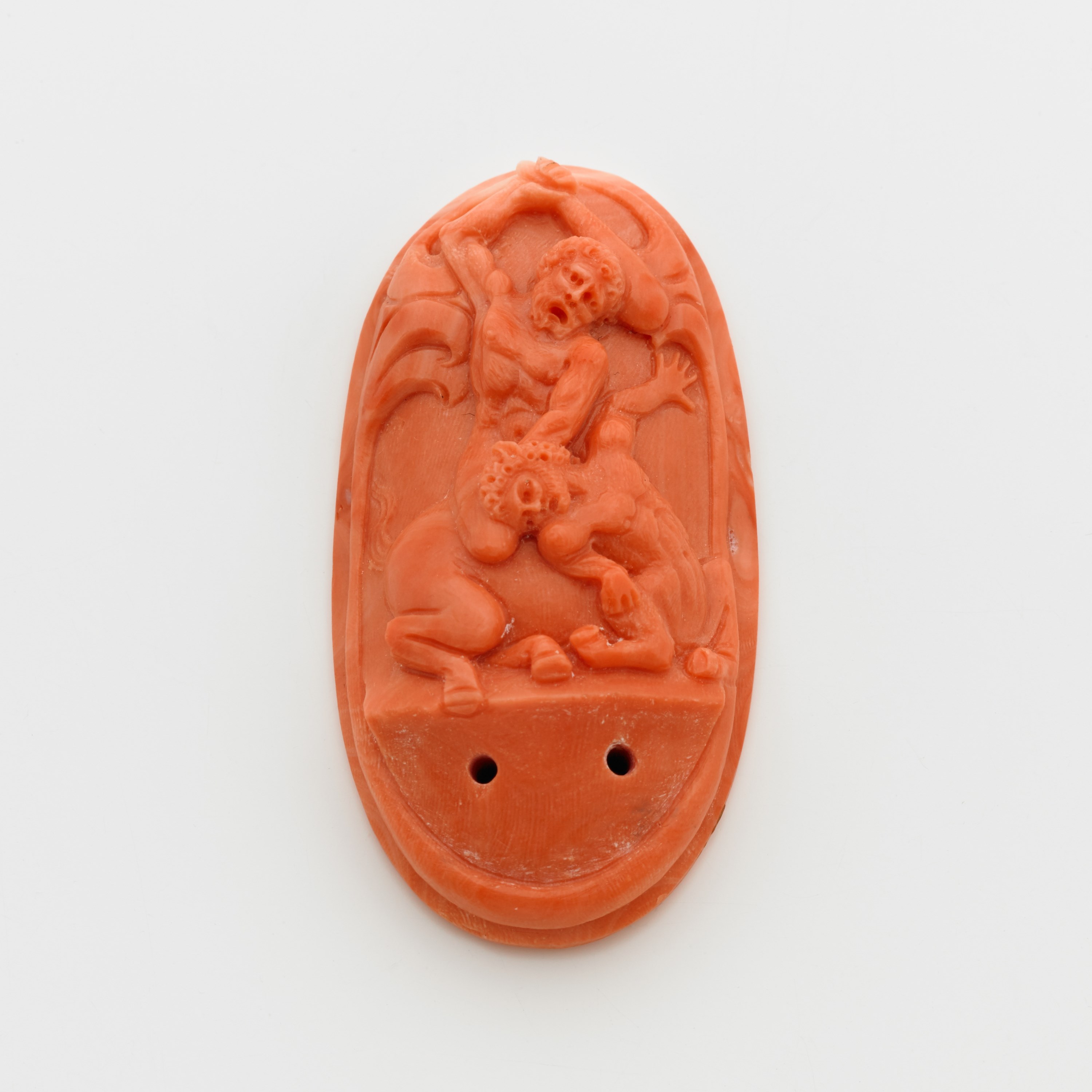 PARLATI-TORRE DEL GRECO Corallo ovale scolpito color salmone lievemente variegato, nella scultura Eracle e il centauro g. 31,60 cm 6x3,10 Sculpted salmon coloured oval coral