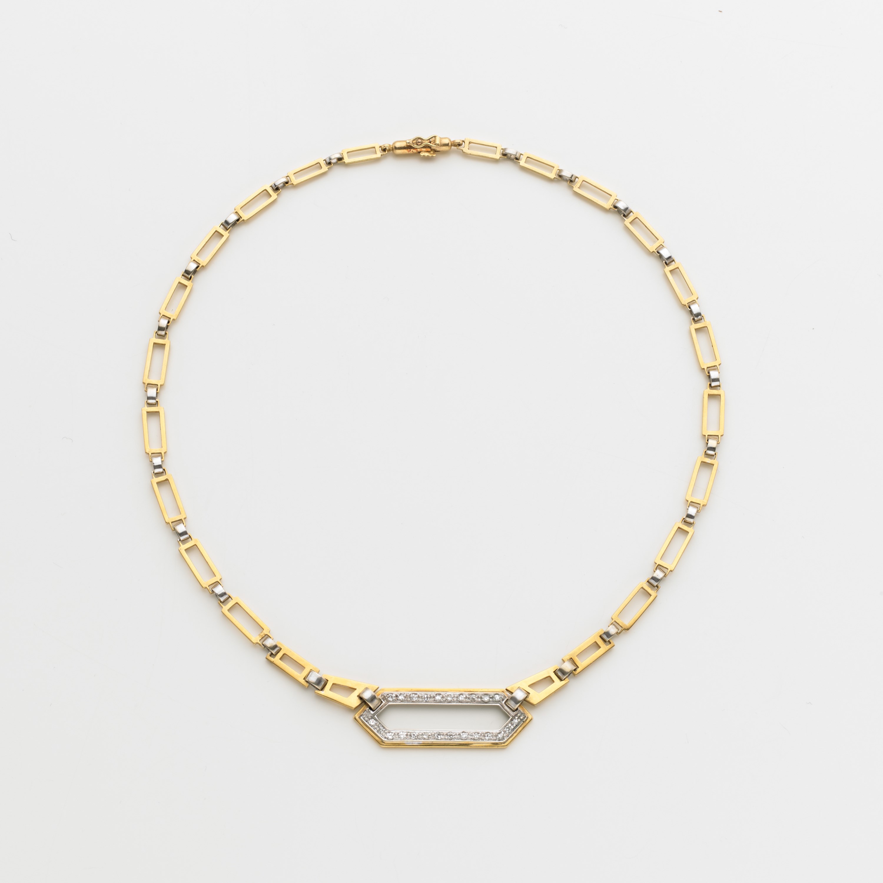 Collier in oro giallo e bianco a maglie rettangolari con centrale esagonale e diamanti rotondi lungh. cm 40 g. 18 Bi-coloured gold and diamond necklace