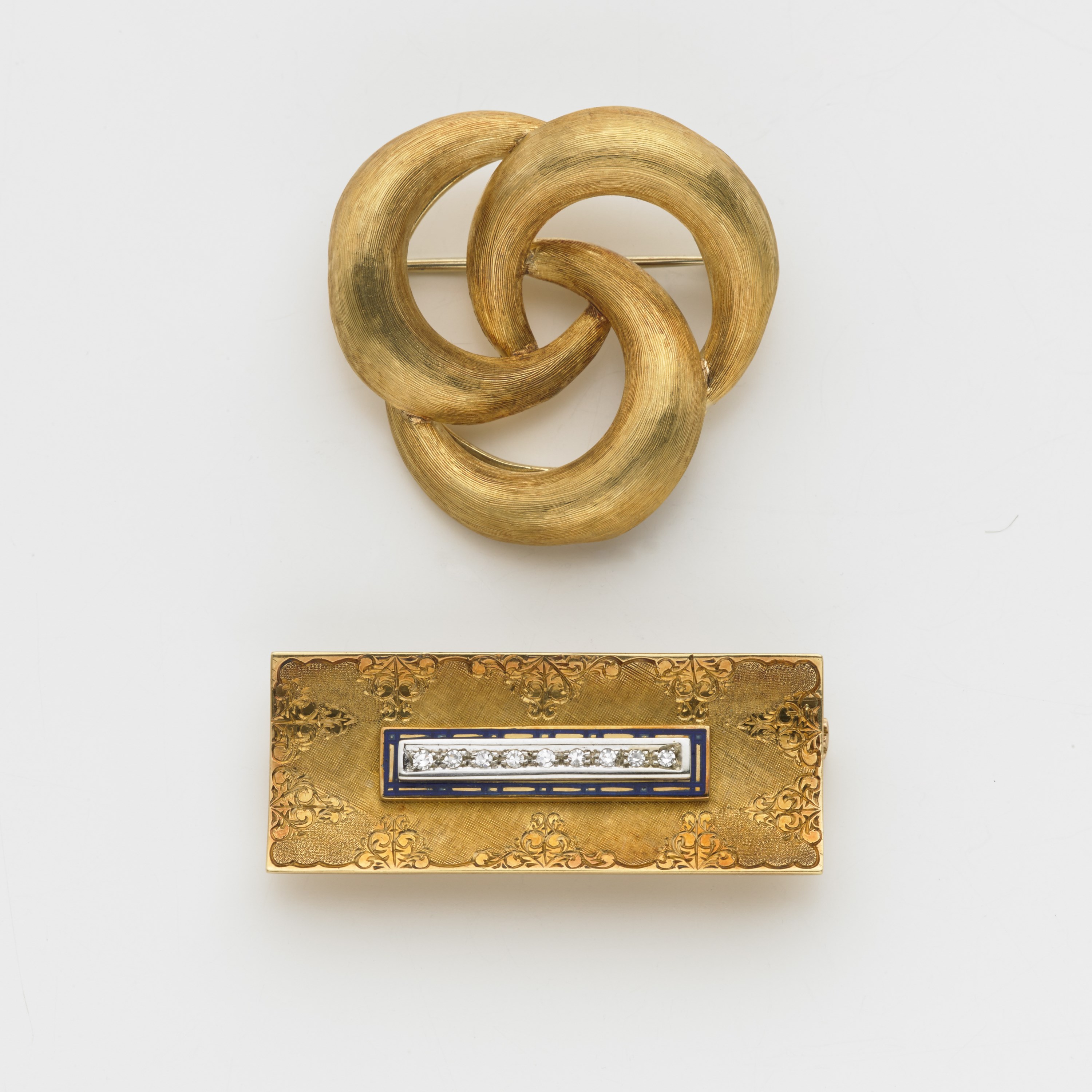 Lotto composto da due spille in oro giallo con lavorazione satinata e lucida a ricamo, rifinitura di smalti blu a contornare barretta di diamanti rotondi su oro bianco g. 18,30 Lot comprising two gold brooches of which one with enamels and diamonds