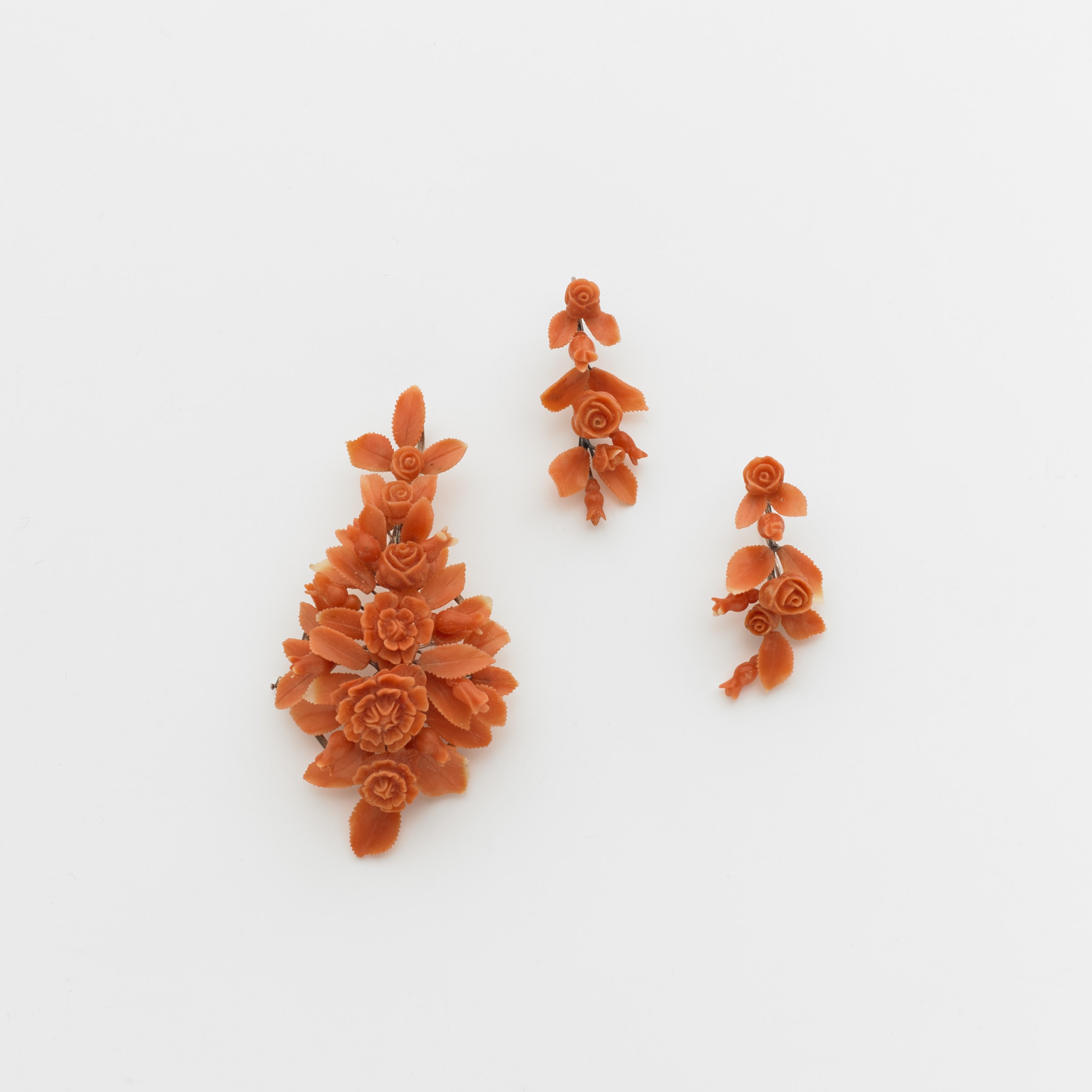 Lotto composto da una spilla/ciondolo e una coppia di orecchini pendenti staccabili in corallo rosa aranciato scolpito e inciso a motivi floreali montati in oro giallo, peso complessivo g.19,40 Pinky orange coral set of jewellery comprising pendant earings and a pendant/brooch