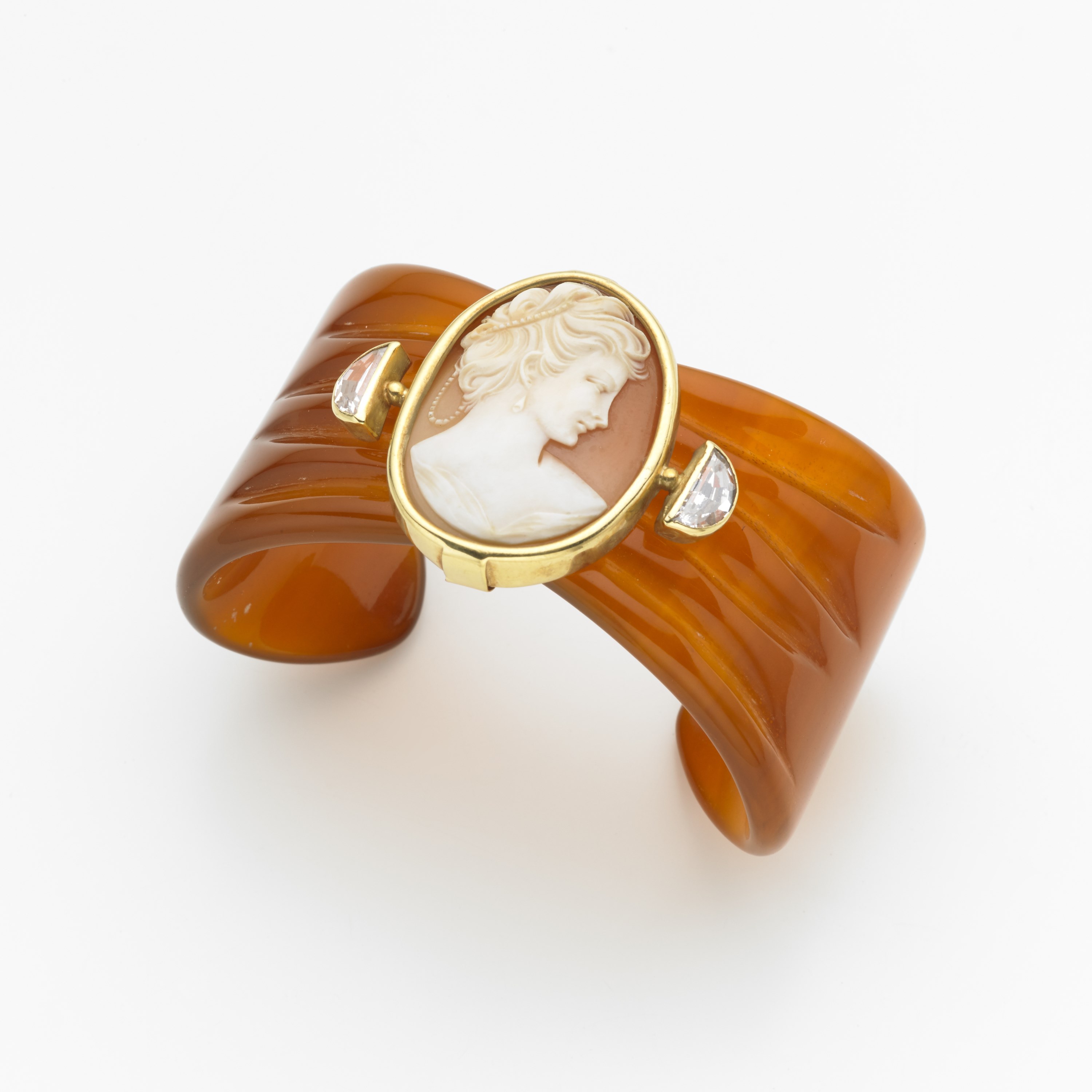 Bracciale rigido in bachelite, cammeo con volto femminile e due pietre...