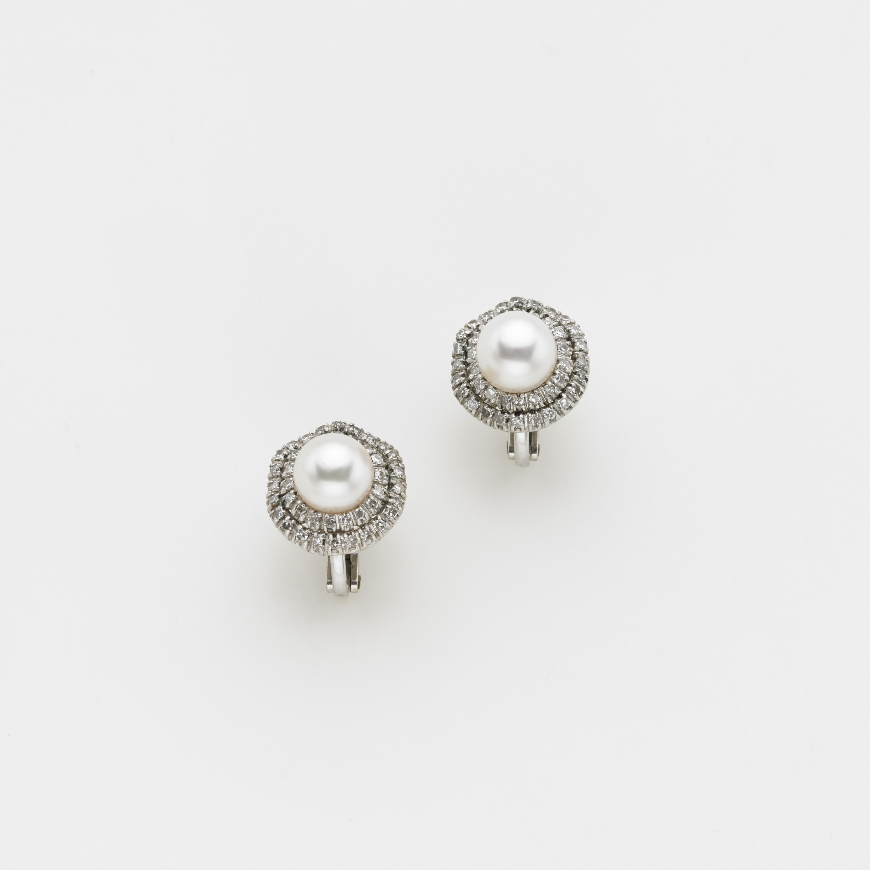 Orecchini in oro bianco a lobo con clips e due giri di diamanti a contornare due perle coltivate bianche mm 8/8,50 g. 9,90 White gold cultured pearl ear-clips with diamond surround