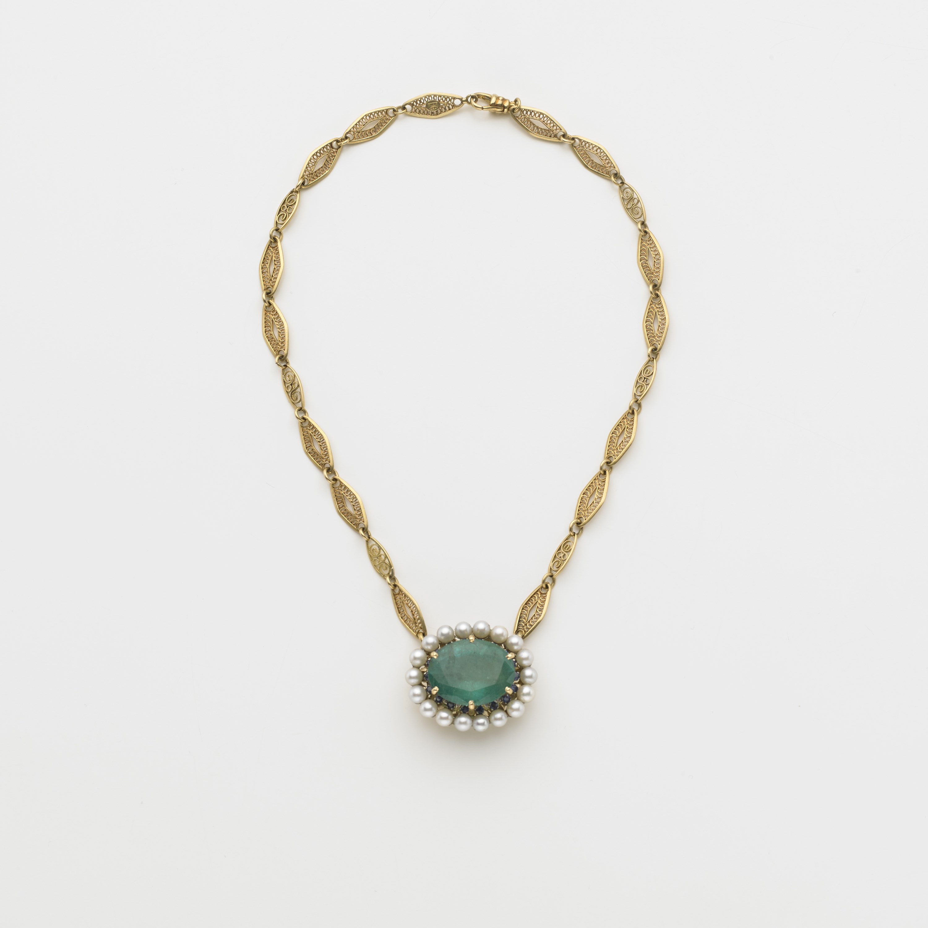 Collana in oro giallo a losanghe lavorate con al centro un grande smeraldo ovale di ct 22 circa, circondato da piccole perle e zaffiri rotondi, g. 30,00 Gold necklace centered by a large oval emerald with pearl and sapphiere surround