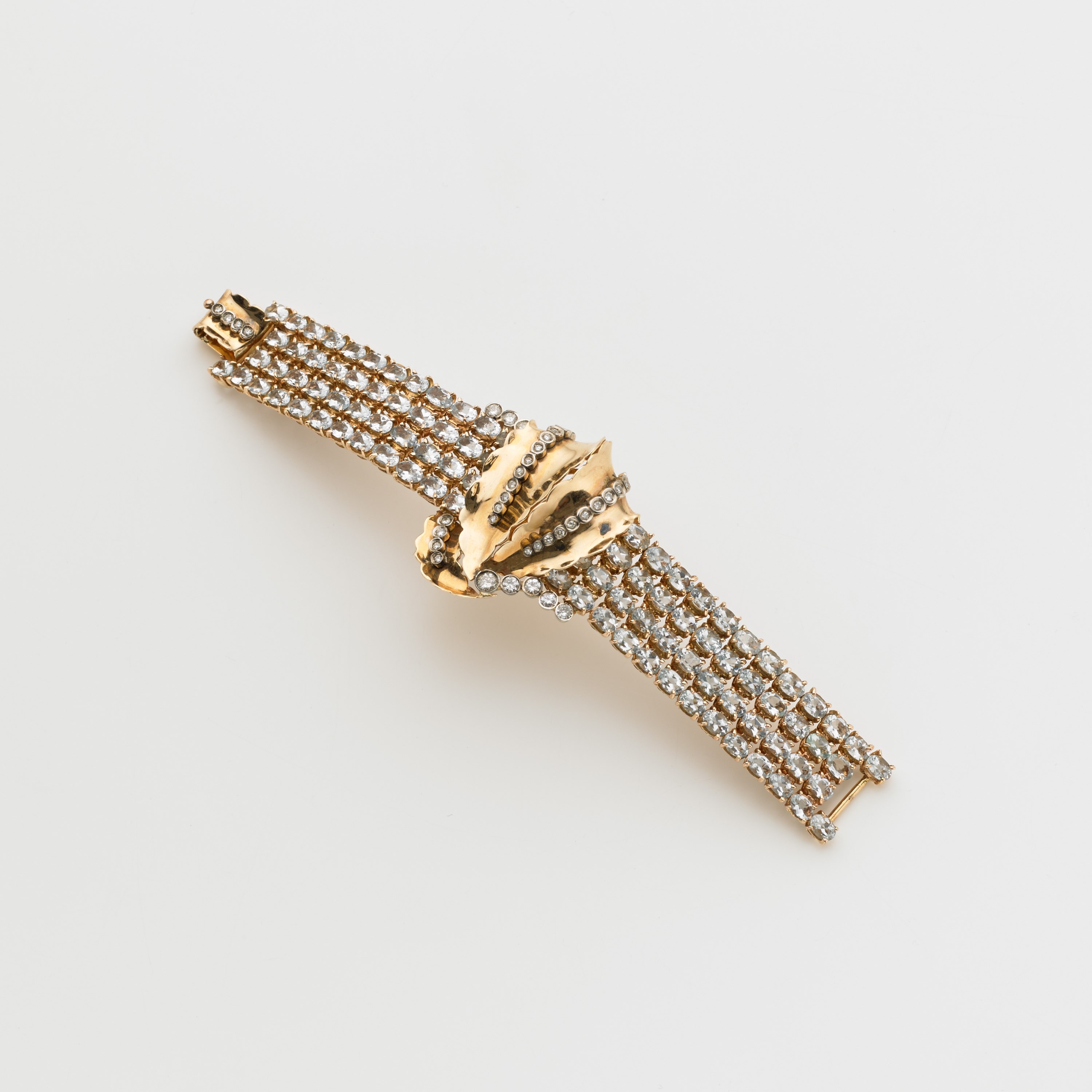 Bracciale in oro giallo/rossatro e bianco con 94 acquamarine ovali taglio composito a formare il bracciale ed al centro un motivo a foglie rifinito con diamanti rotondi taglio a brillante lungh. cm 18 h da cm 4,70 a cm 2,20, g. 76,20. Copia del modello creato da Tomkins per Joan Crawford, acquistato da Andy Warhol all'asta Bi-coloured gold bracelet with acquamarines and diamonds. Copy of the model created by Tomkins for Joan Crawford and bought at an auction by Andy Warhol