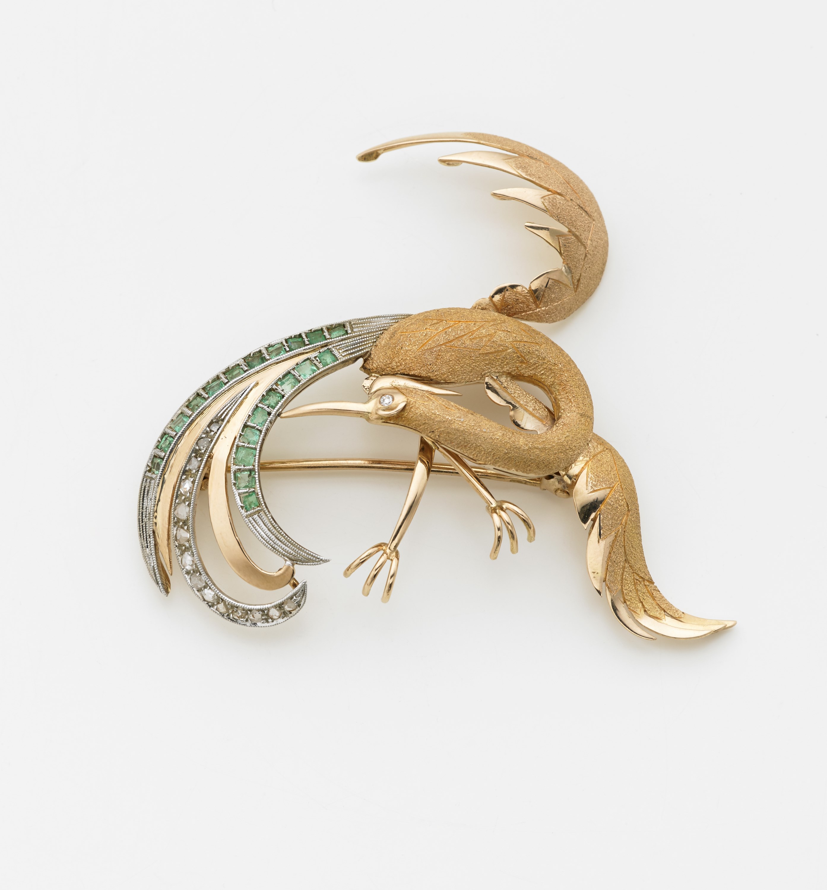 Spilla a guisa di uccello del paradiso in oro rosso zigrinato lucido e satinato, oro bianco con smeraldi quadrati e un diamante rotondo g. 11,80 cm 6 Bi-coloured gold and emerald and diamond bird of paradise brooch