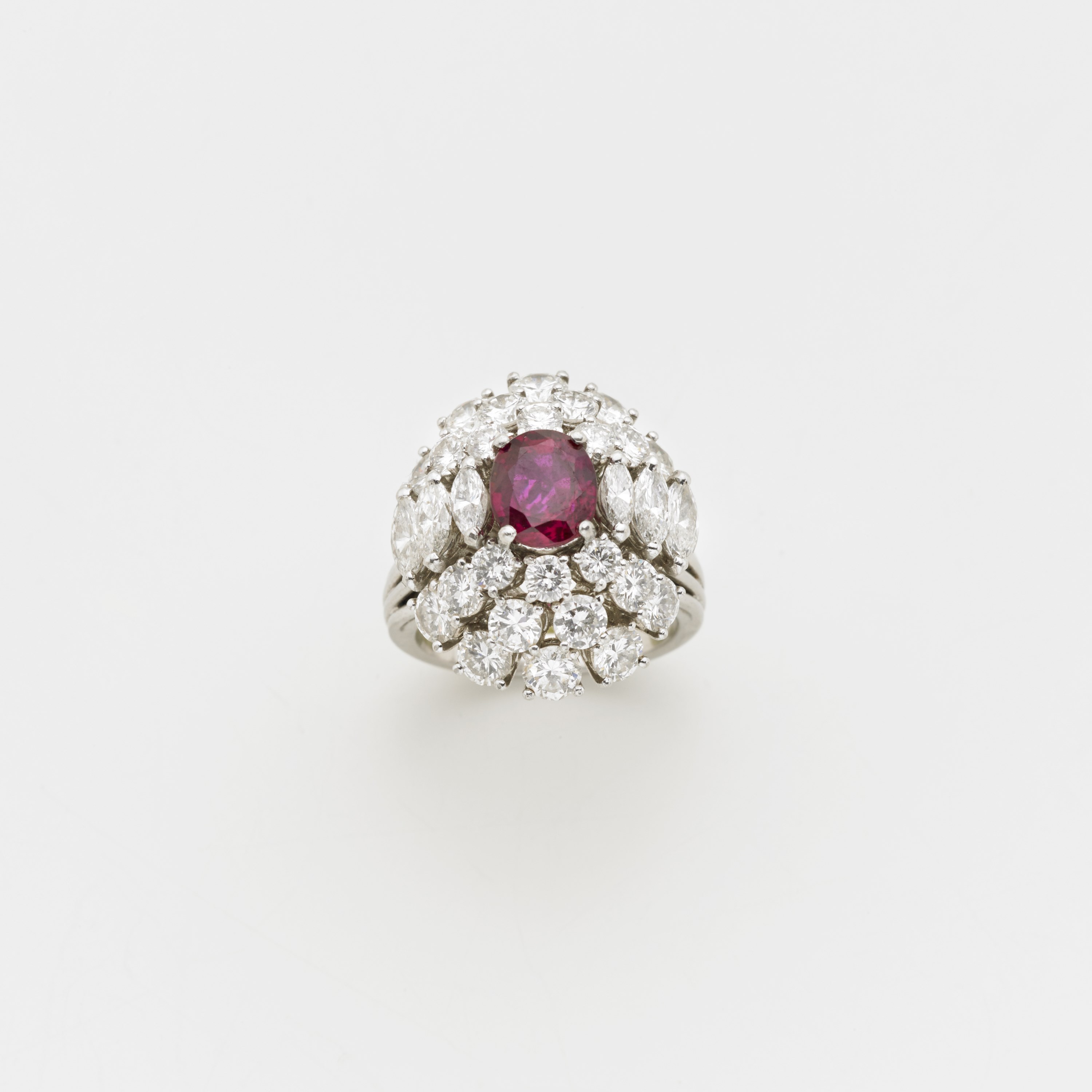 Anello in platino con diamanti rotondi a navette ed al centro uno rubino ovale di ct 2,20 circa, g. 14,20 misura 14/54 Ruby and diamond platunum cluster ring
