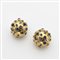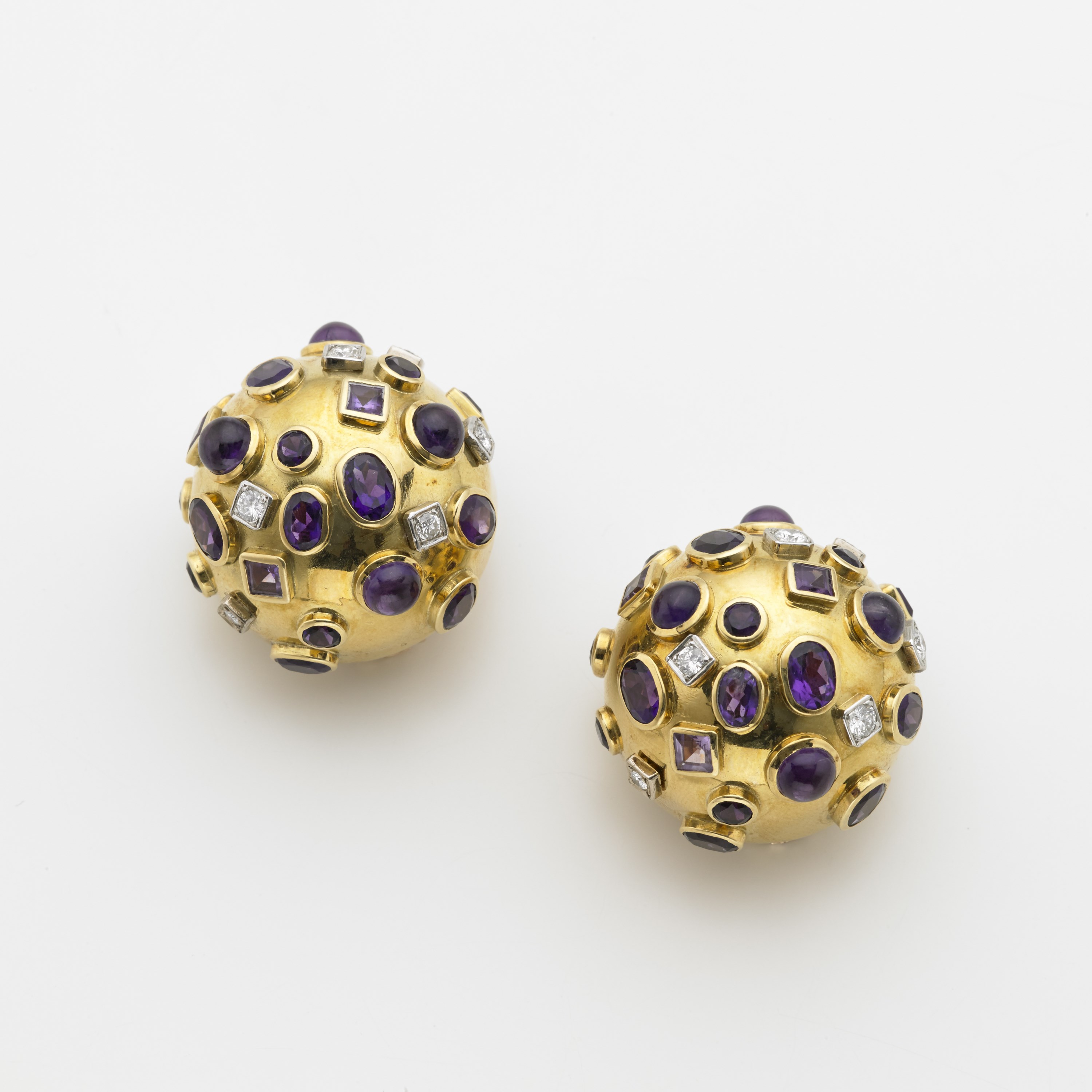 Orecchini a lobo con clips, a mezza boule in oro giallo, rosso e bianco con incastonati diamanti rotondi taglio a brillante ed ametiste di varia forma e taglio, complessivi g. 46,80 Tri-coloured gold half-boule ear-clips inset with diamonds, and amethysts