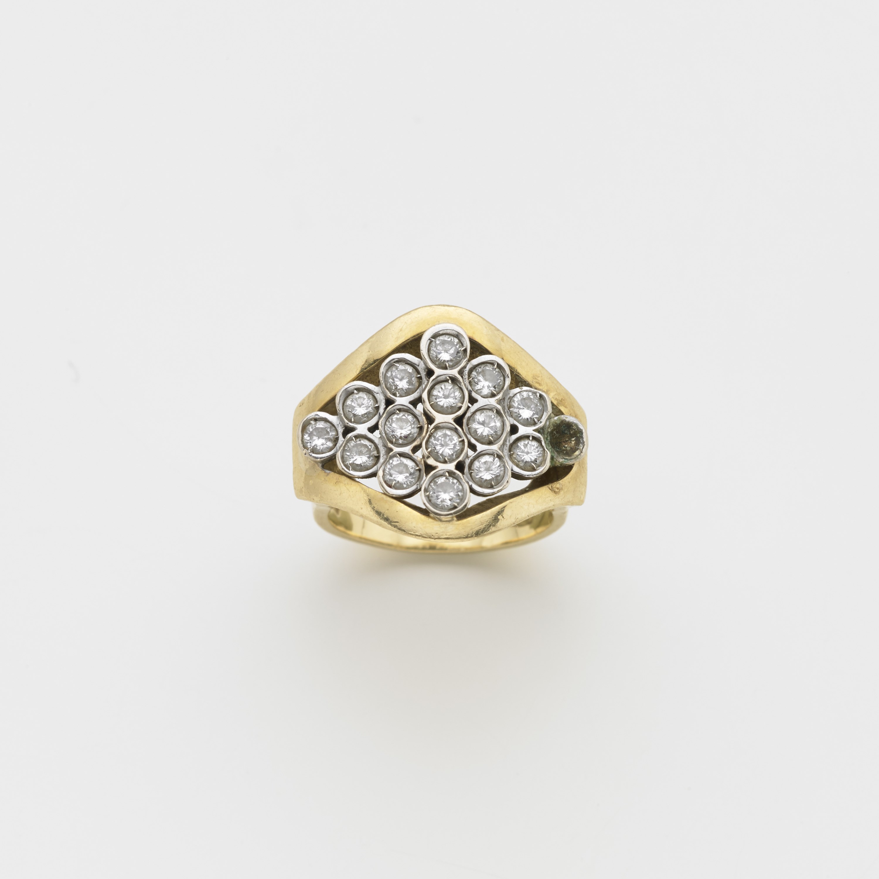 Anello in oro giallo e bianco con diamanti rotondi taglio a brillante, g. 11,80, misura 12/52 (una pietra mancante) Bi-coloured gold and diamond ring. One diamond deficient