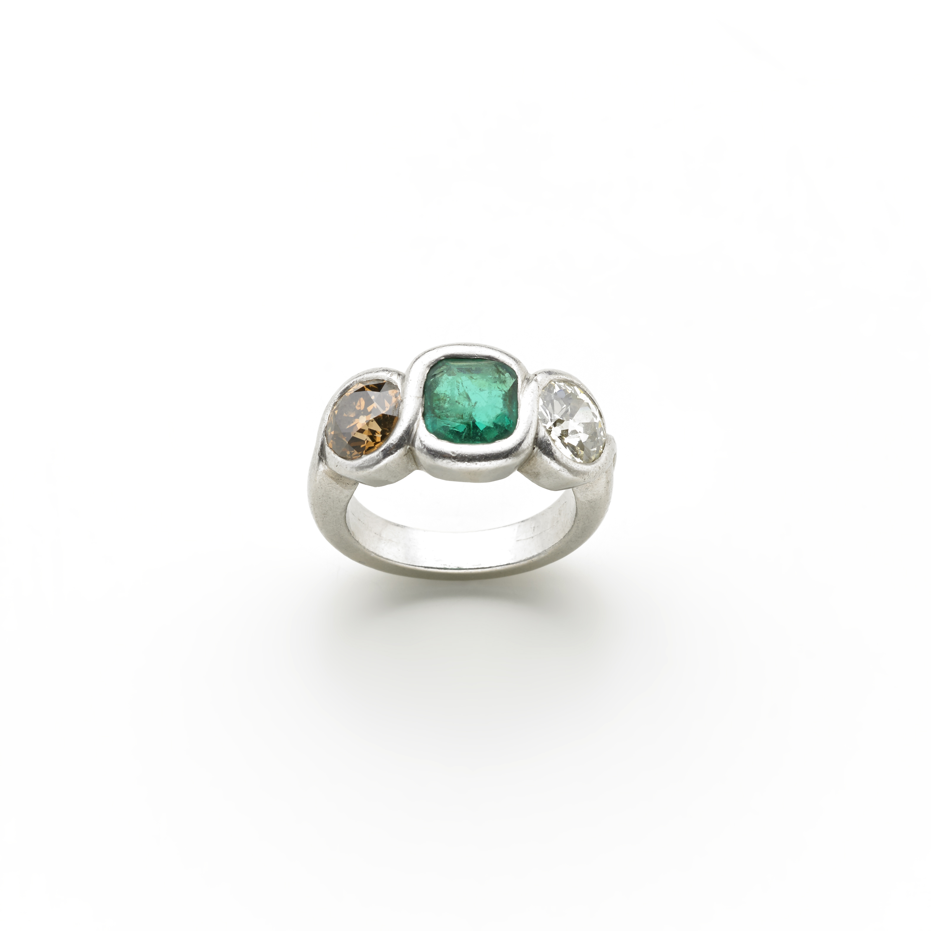 Anello in oro bianco con smeraldo a cuscino, taglio composito ct.1,35 circa e due diamanti rotondi, taglio a brillante vecchio europeo, entrambe ct, 1,12 circa circa (uno Fancy yellow/brown ), g. 15,80 Prov.: nonno paterno Lodovico Marchese Guerrieri Gonzaga White gold ring with an emerald and two diamonds (one fancy yello/brown) Provenance Grandfather Lodovico Marquess Guerrieri Gonzaga