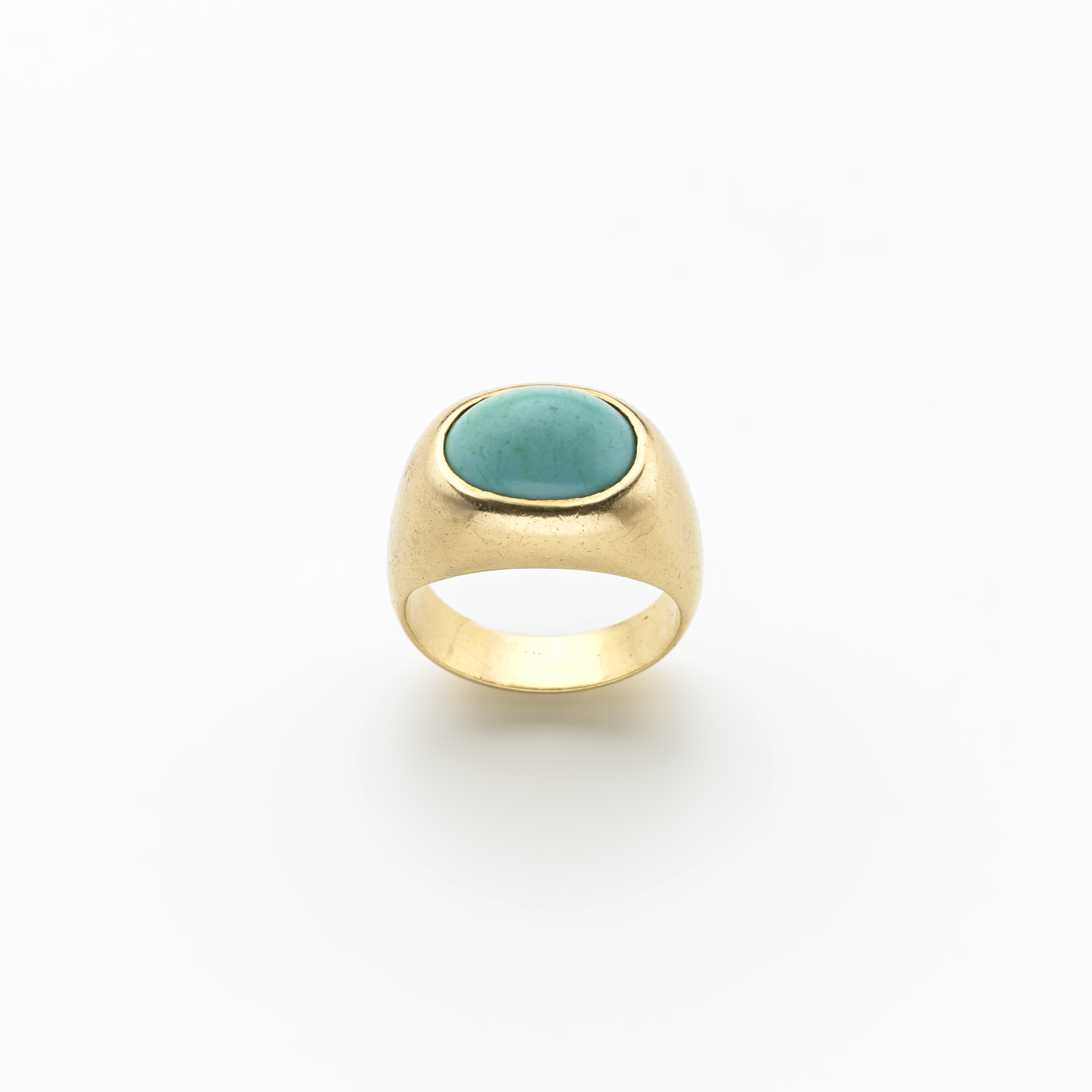 Anello in oro giallo con turchese ovale, taglio cabochon, g. 13,70 misura 12/52 Prov.: dono del Marchese Giambattista Guerrieri Gonzaga alla madre Emilia Marchesa Guerrieri Gonzaga, nata Vimercati Sanseverino, C.ssa di Palazzo Pignano Cabochon turquoise gold ring Provenance: present from Giambattista Marquess Guerrieri Gonzaga to his mother Marchioness Emilia Guerrieri Gonzaga born Vimercati Sanseverino Countess Palazzo Pignano