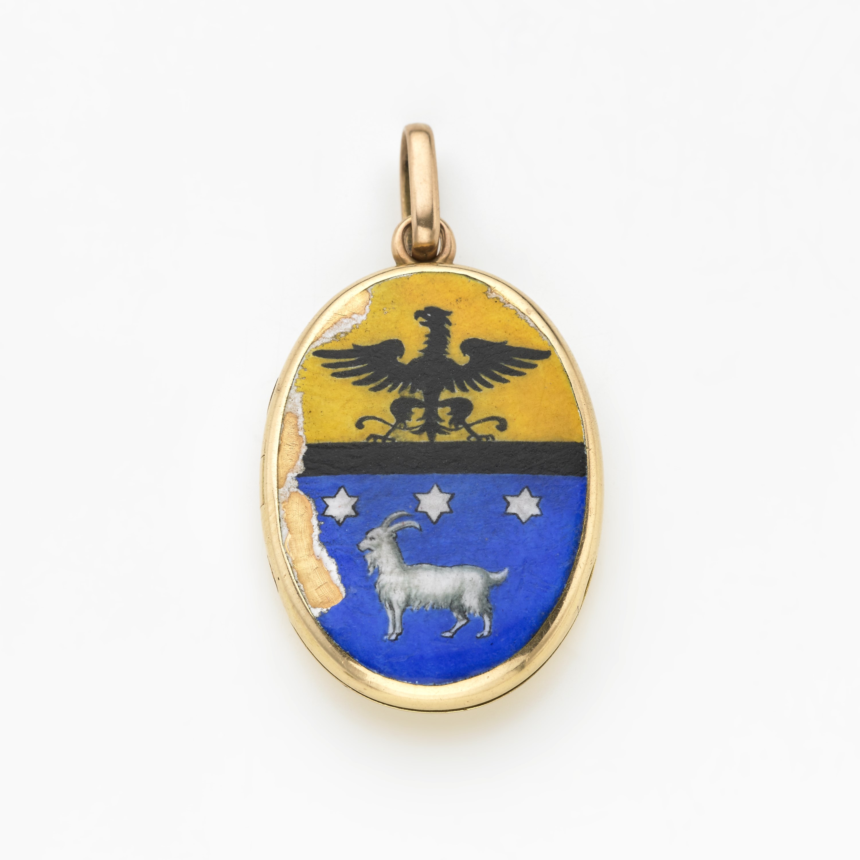 Portafoto ovale con stemmi smaltati rappresentanti da un lato lo stemma Martini Giovio della Torre di Rezzonico Lattuada dall'altro lo stemma Rossi Martini Giovio della Torre g. 12,60 (difetti allo smalto) Prov.: linea materna in occasione delle nozze Rossi Martini e Martini Giovio della Torre Oval frame with engraved the coat-of-arms of the Martini Giovio della Torre di Rezzonico Lattuada and the Rossi Martini Giovio della Torre (defects to enamel)
